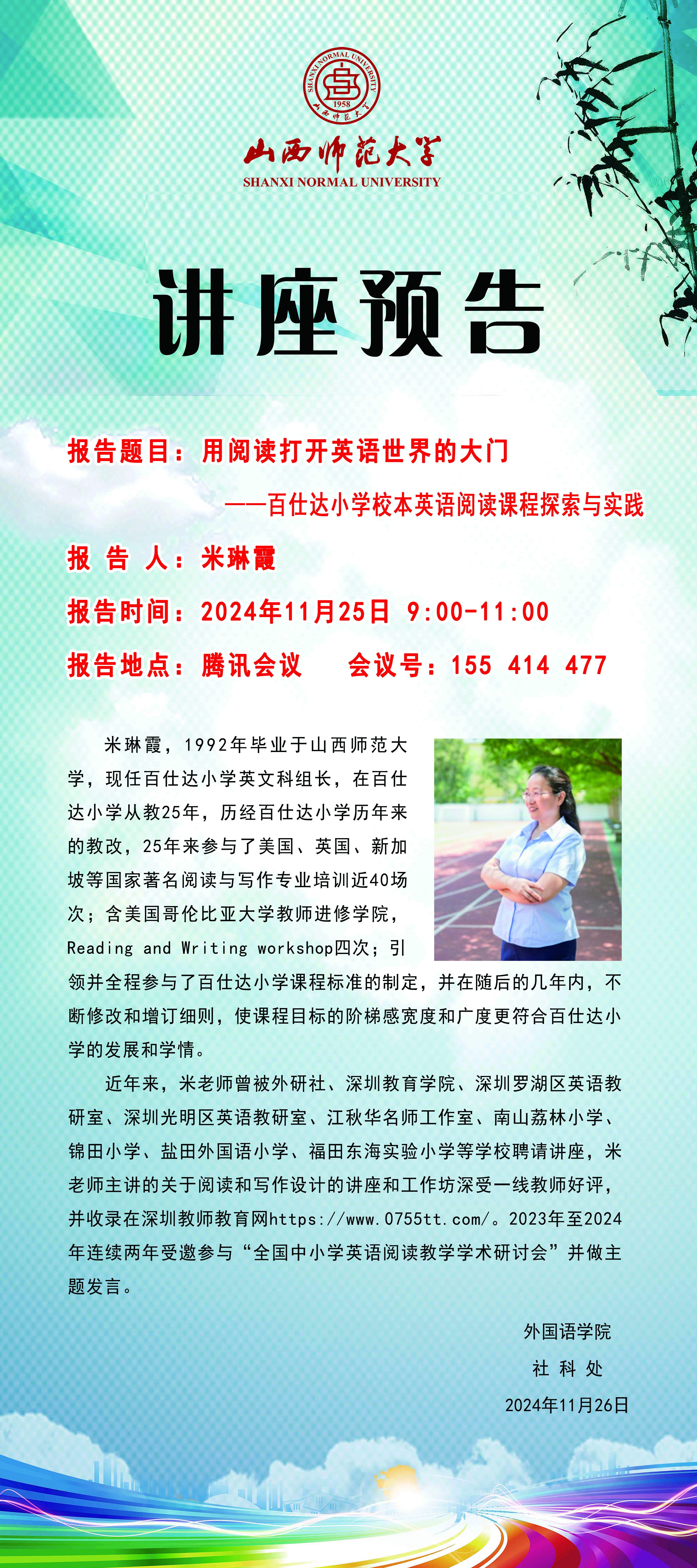 【预告】深圳百仕达小学米琳霞老师应外国语学院邀请作学术报告