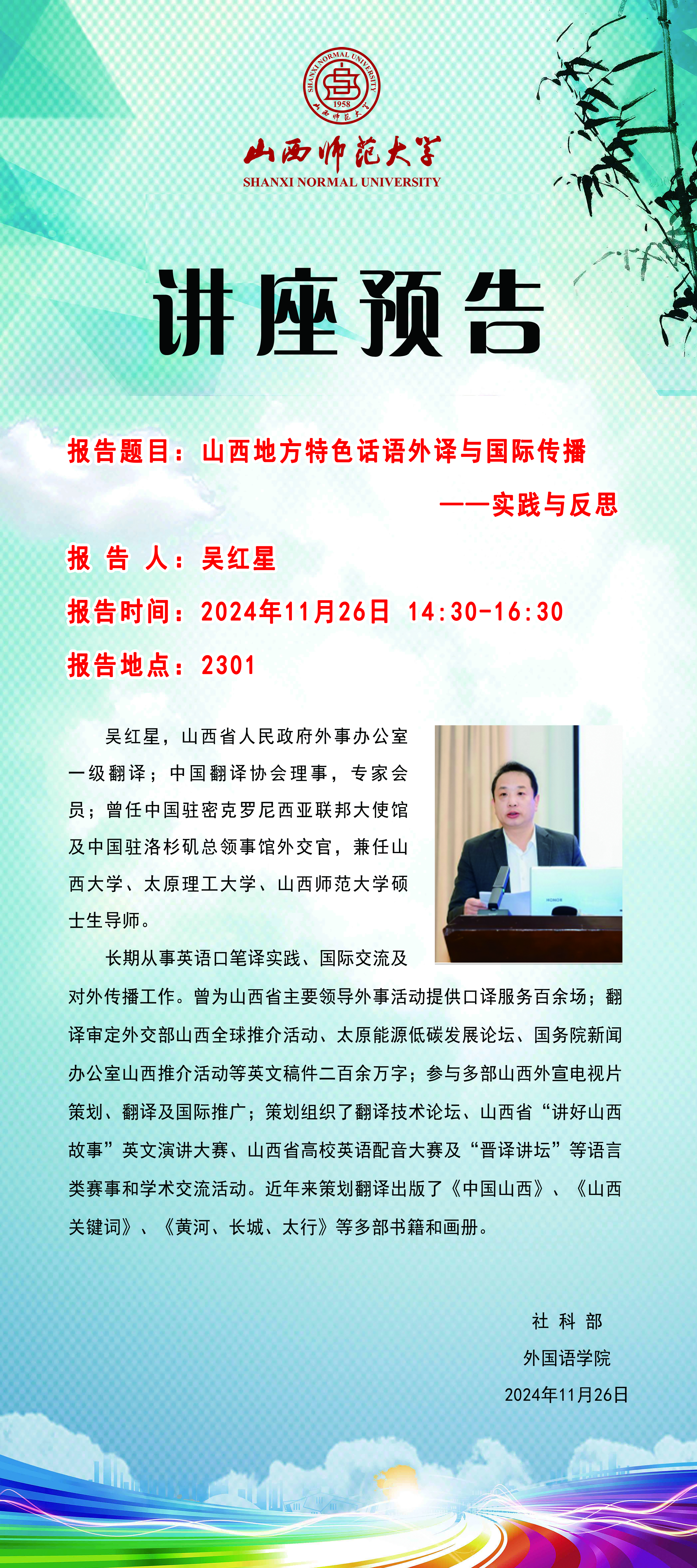【预告】山西省人民政府外事办公室一级翻译吴红星应外国语学院邀请作学术报告