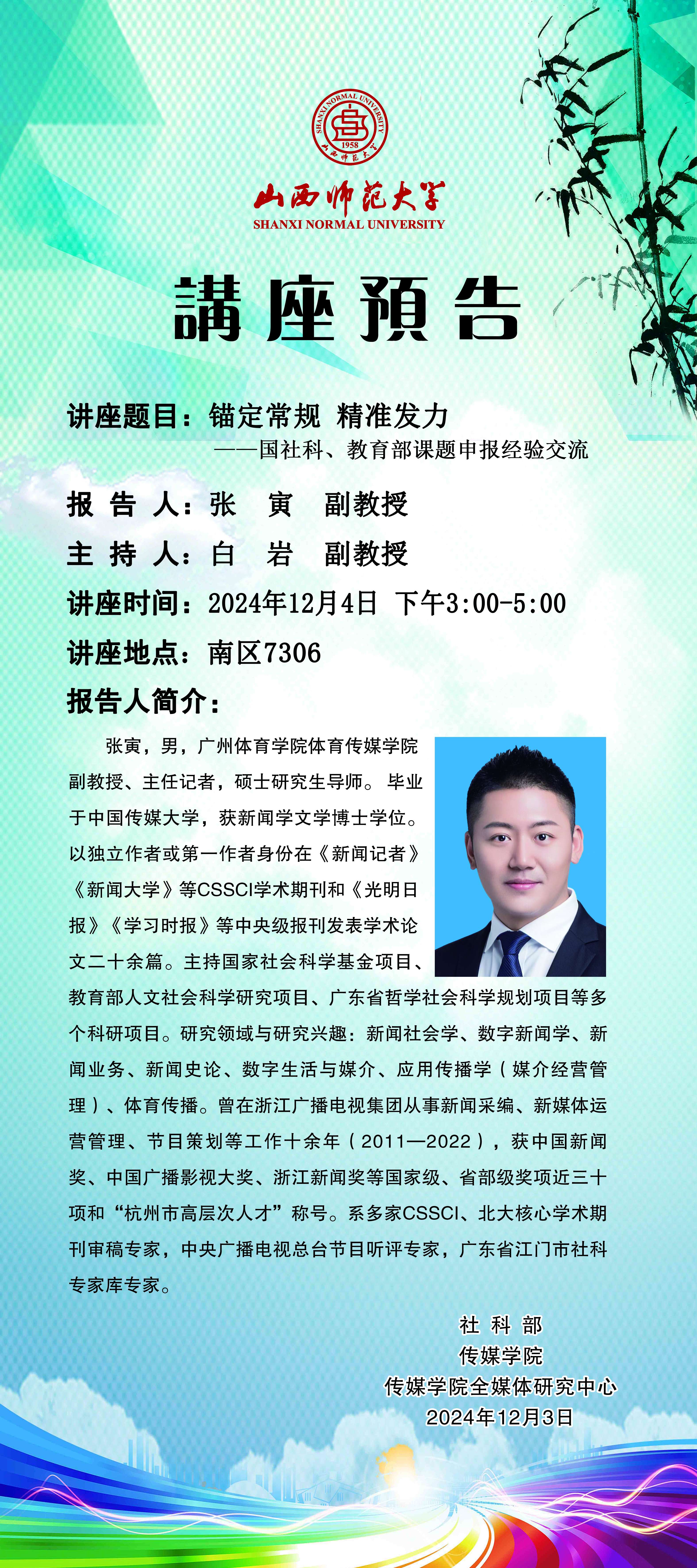 【预告】广州体育学院张寅副教授应永利官网传媒学院邀请作学术报告