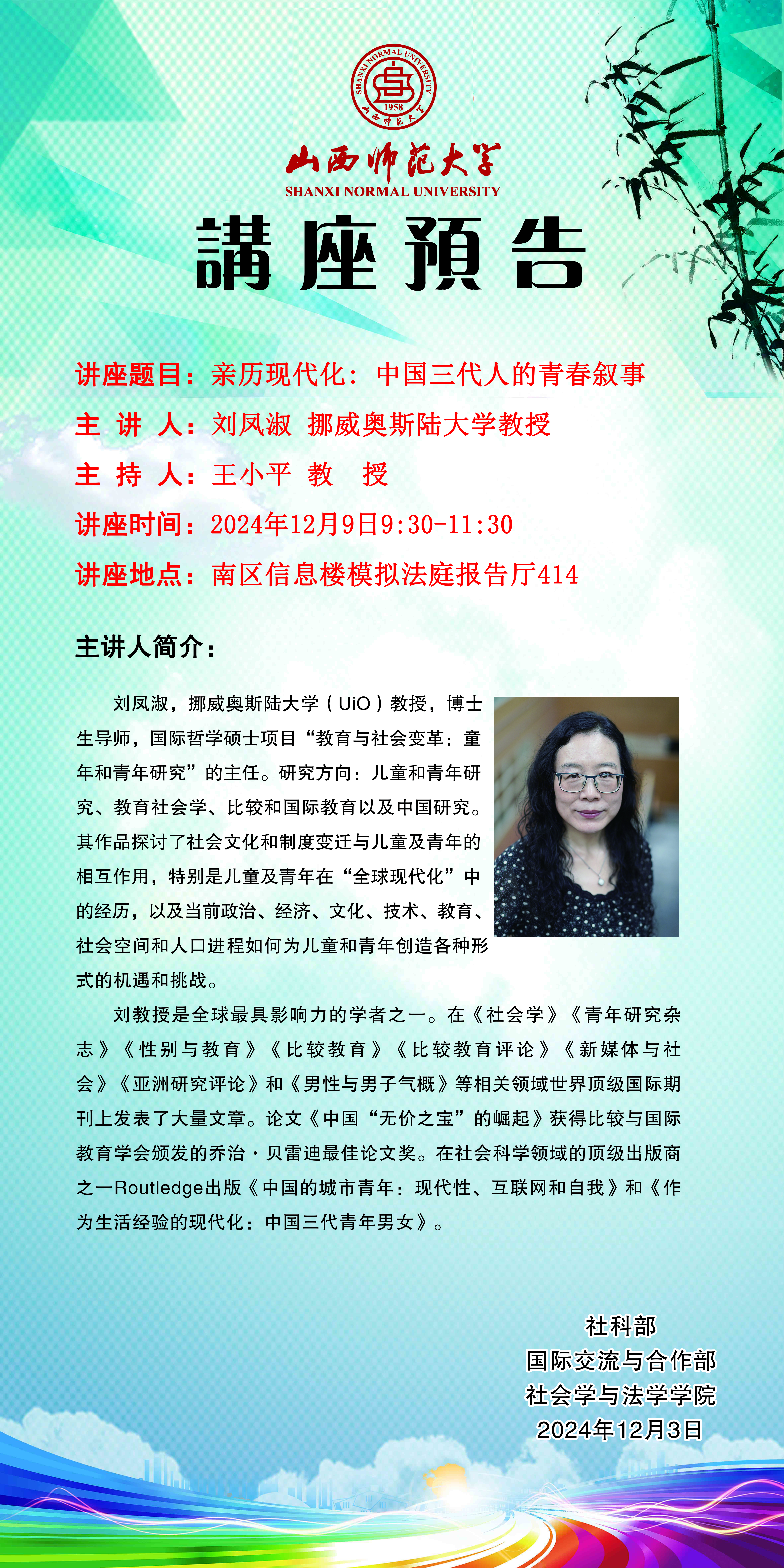 【预告】挪威 奥斯陆大学刘凤淑教授应永利官网社会学与法学学院邀请作学术报告