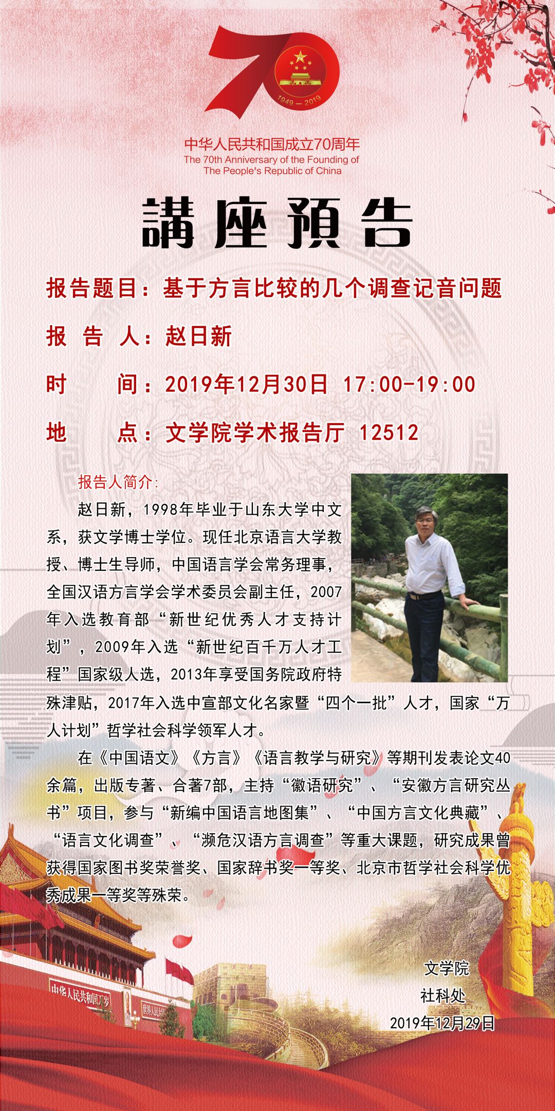 【预告】北京语言大学教授赵日新应文学院邀请来永利官网作学术报告