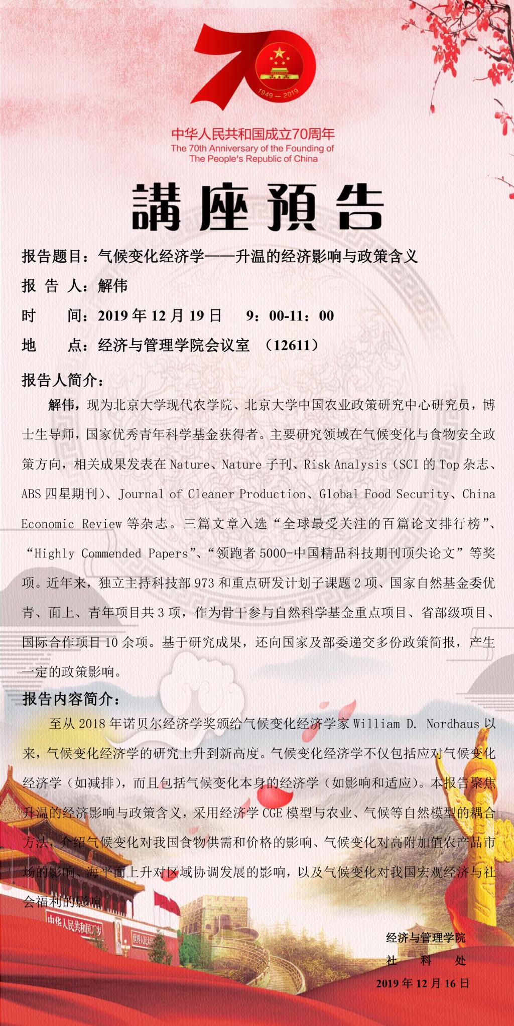 【预告】 北京大学现代农学院解伟研究员应经济与管理学院邀请来永利官网作学术报告