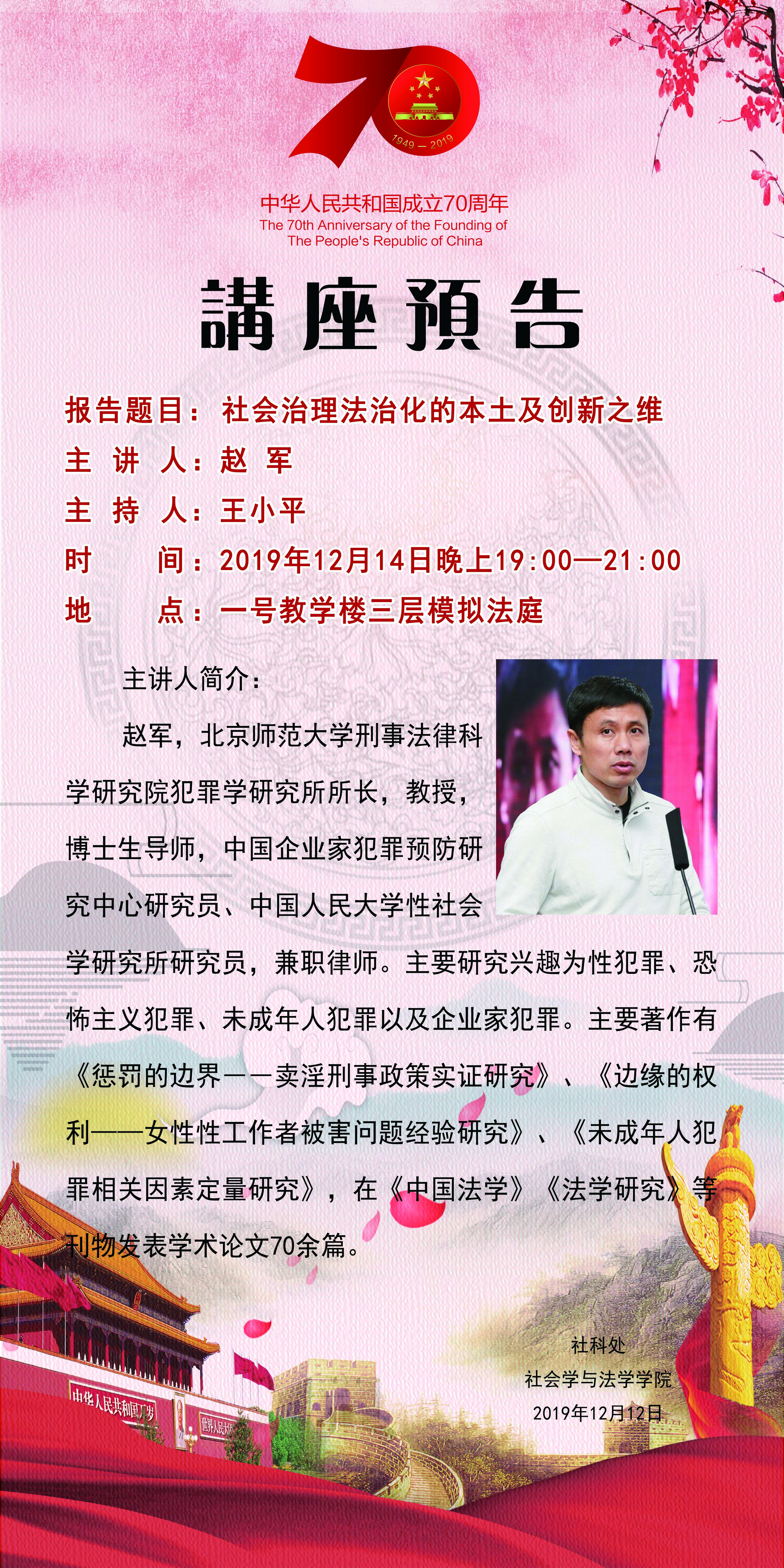 【预告】 北京师范大学刑事法律科学研究院犯罪学研究所所长赵军教授应社会学与法学学院邀请来永利官网作学术报告