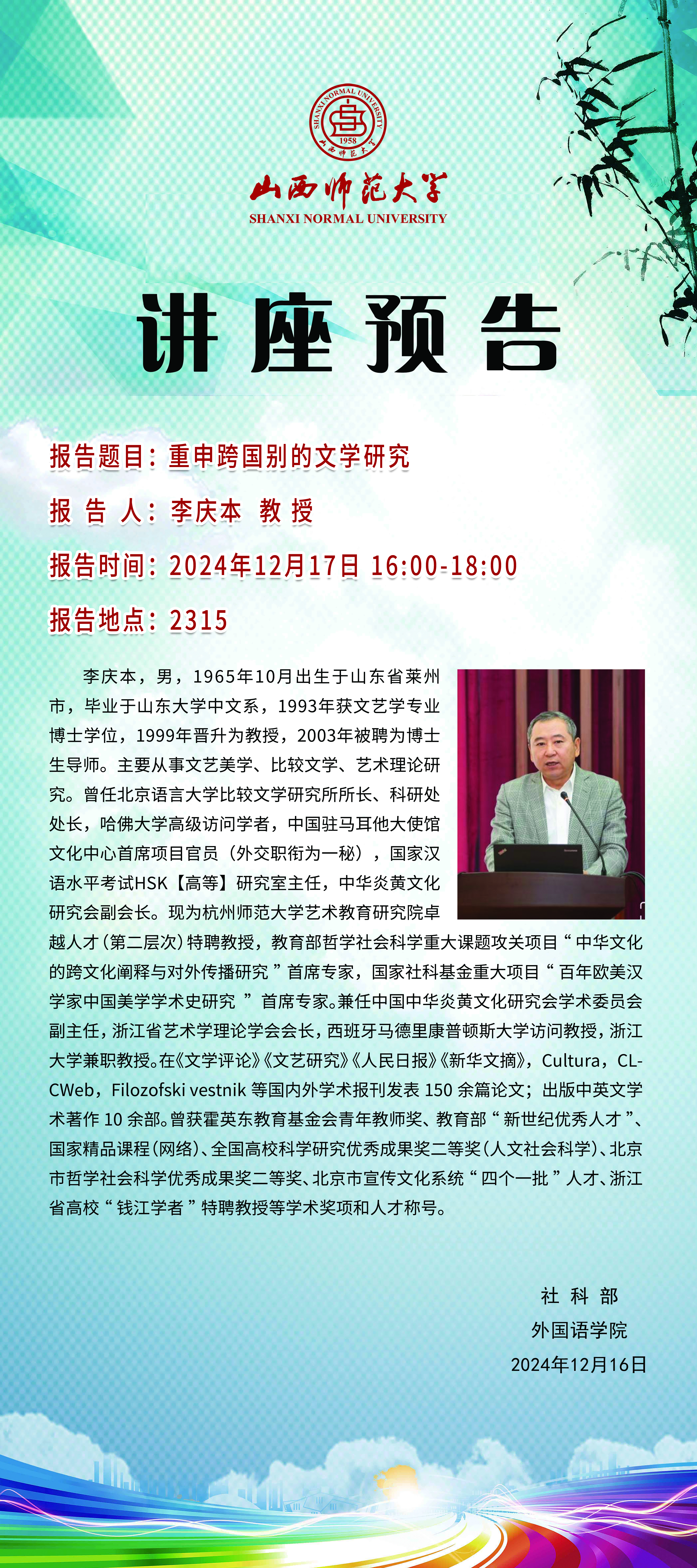 【预告】杭州师范大学艺术教育研究院李庆本教授应外国语学院邀请作学术报告