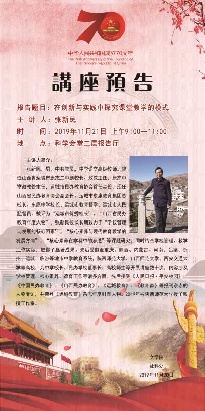 【预告】 运城市东康中学张新民校长应文学院邀请来永利官网作学术报告