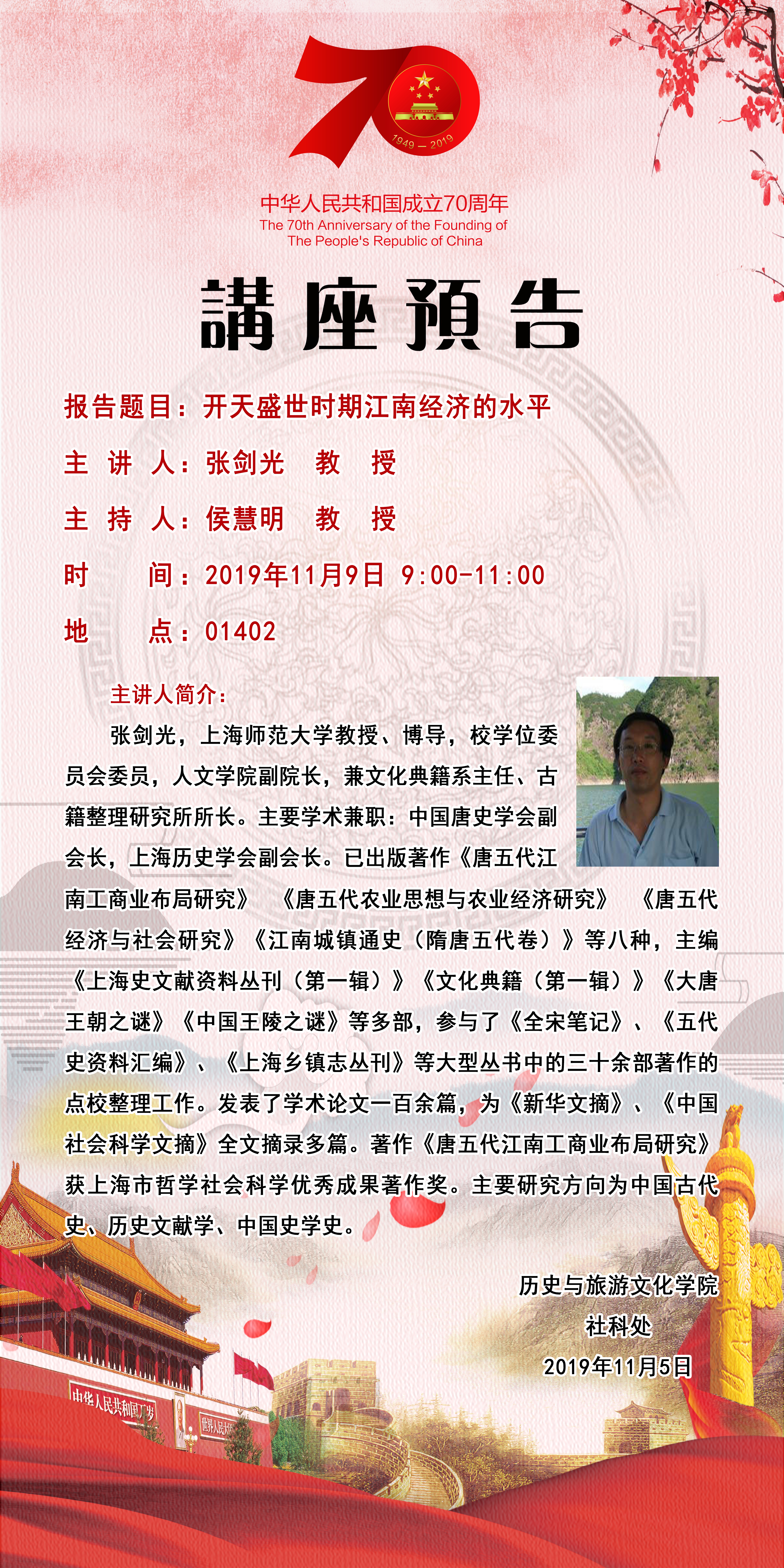 【预告】 上海师范大学张剑光教授应历史与旅游文化学院邀请来永利官网作学术报告