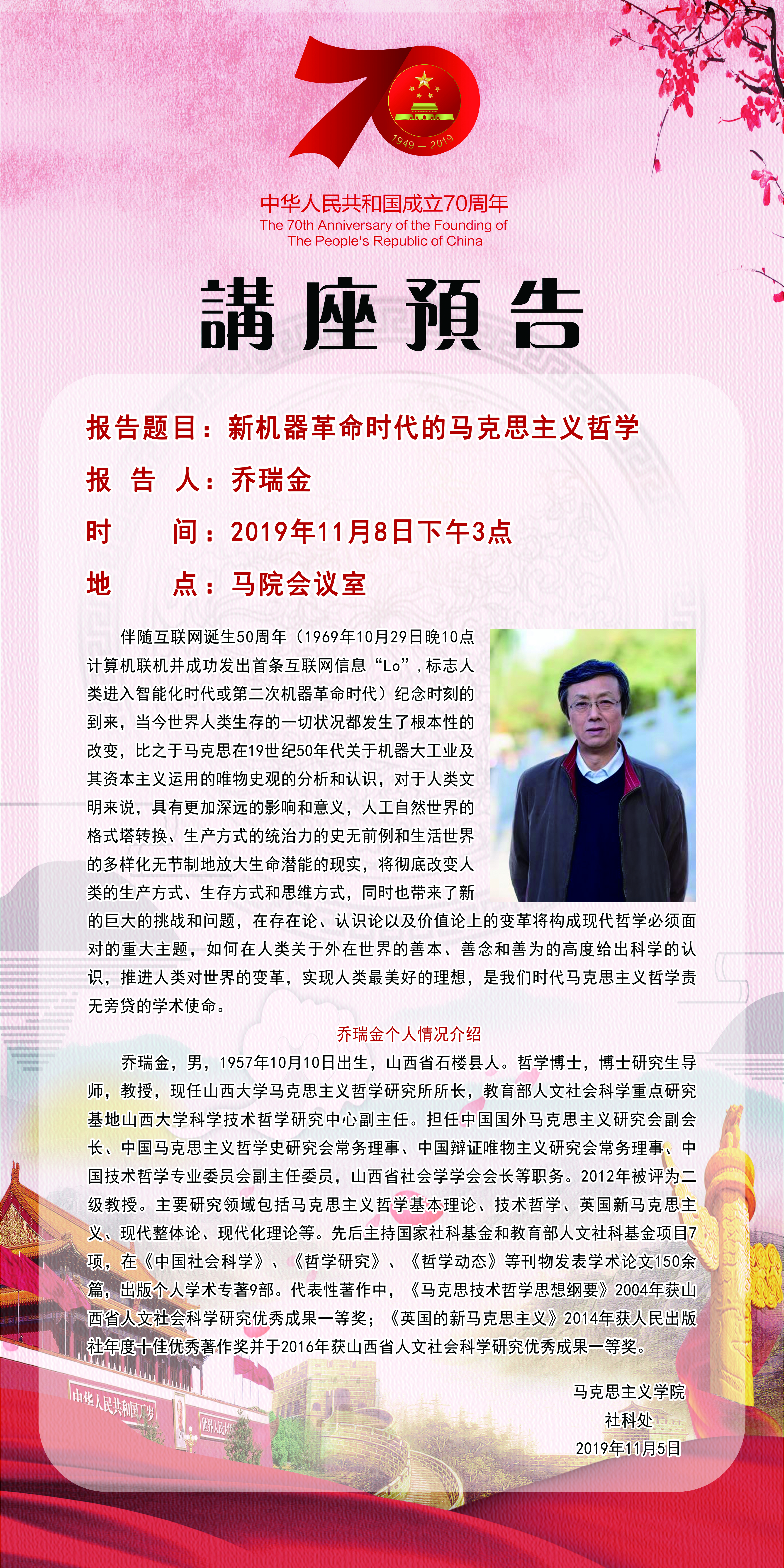 【预告】 山西大学乔瑞金教授应马克思主义学院邀请来永利官网作学术报告
