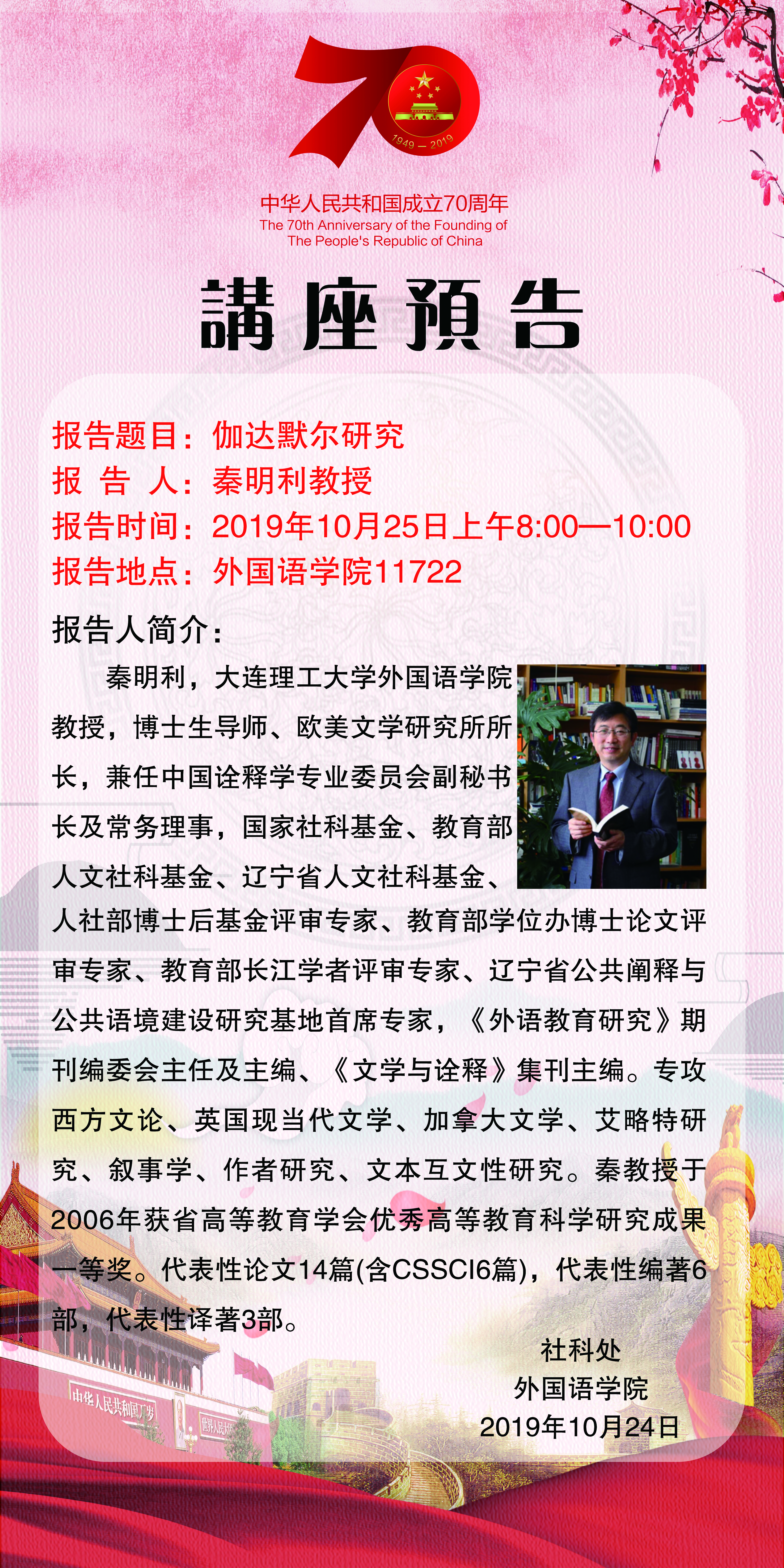 【预告】 大连理工大学秦明利教授应外国语学院邀请来永利官网作学术报告