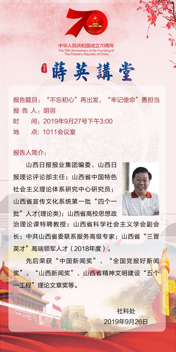 【预告】【莳英讲堂】山西日报理论评论部胡羽主任应邀来永利官网作学术报告