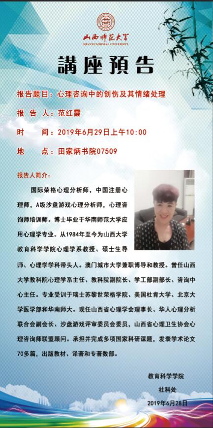 【预告】 山西省心理学会理事长范红霞教授应教育科学学院邀请来永利官网作学术报告