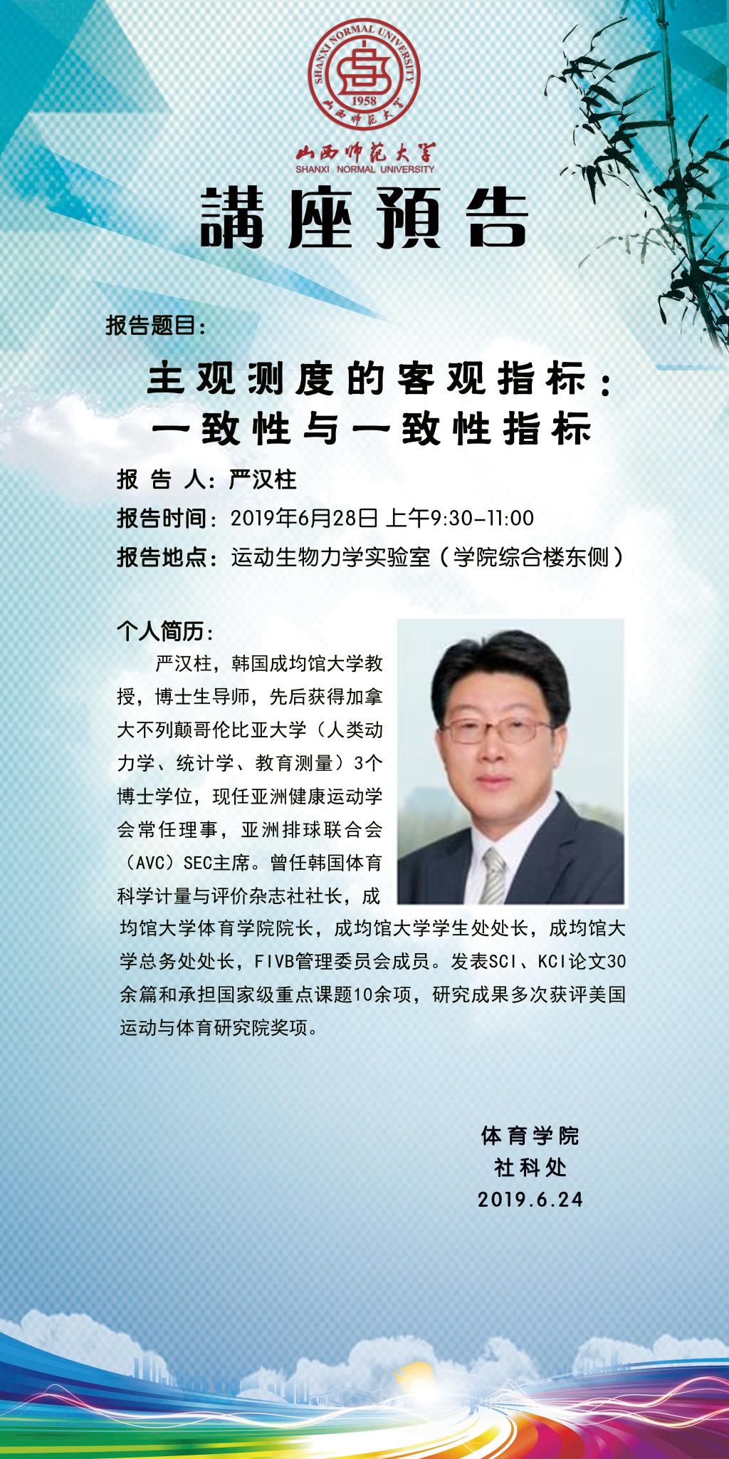 【预告】 韩国成均馆大学严汉柱教授应体育学院邀请来永利官网作学术报告