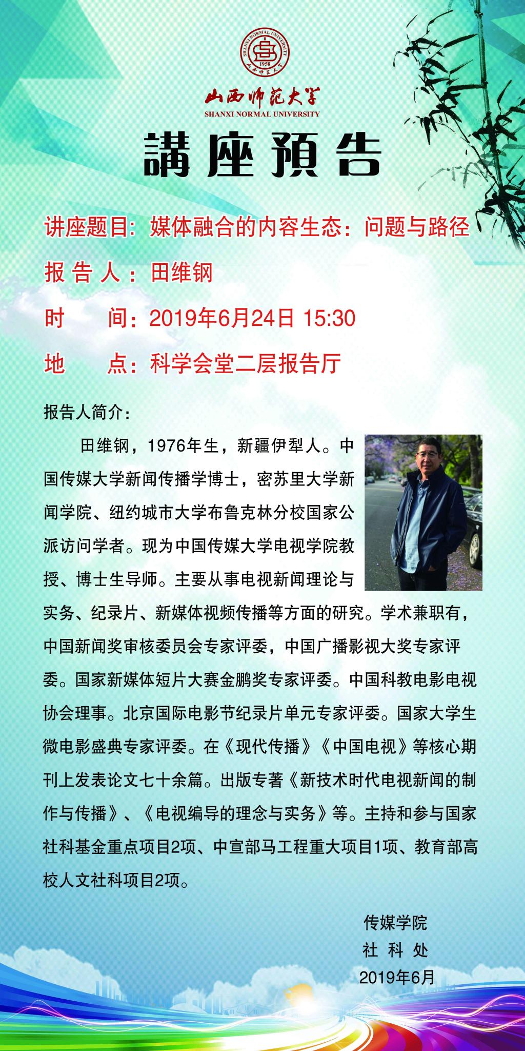【预告】 中国传媒大学田维钢教授应传媒学院邀请来永利官网作学术报告