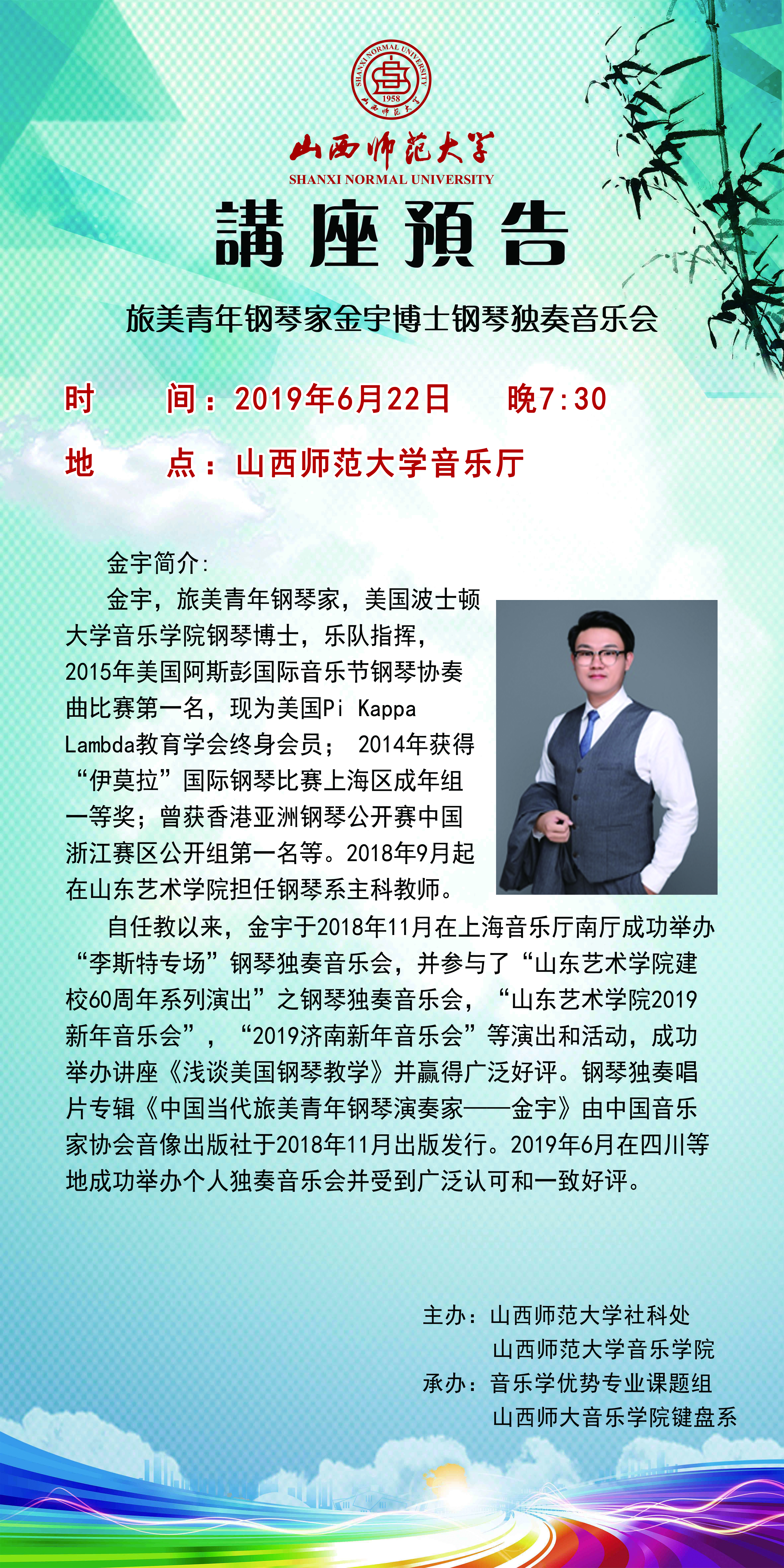 【预告】 旅美青年钢琴家金宇博士应音乐学院邀请来永利官网举办钢琴独奏音乐会