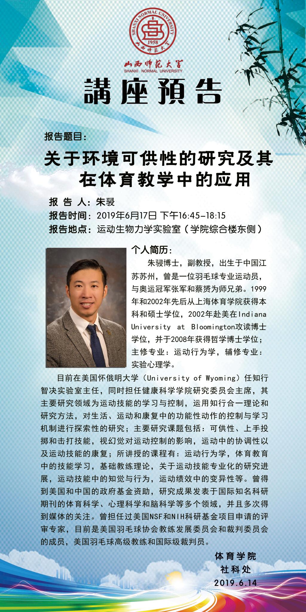 【预告】 美国怀俄明大学朱骎博士应体育学院邀请来永利官网作学术报告