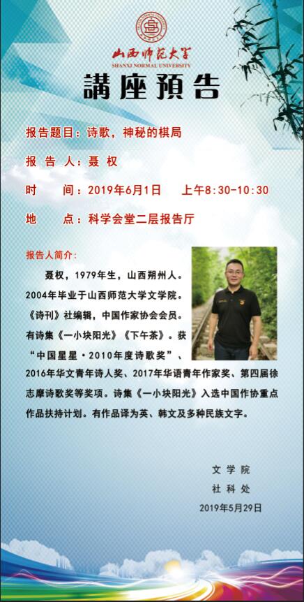 【预告】 中国作家协会会员、《诗刊》社聂权编辑应文学院邀请来永利官网作学术报告
