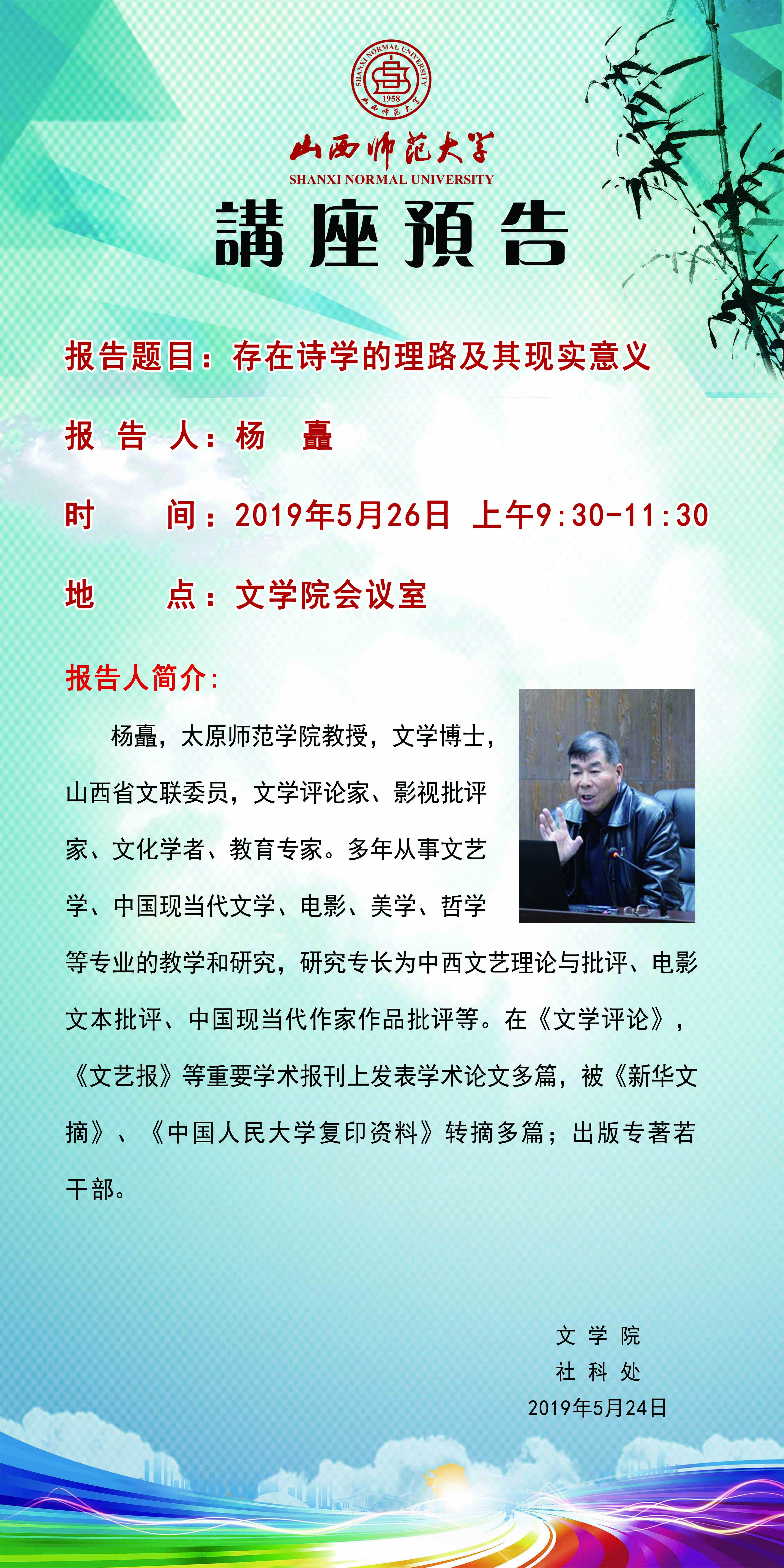 【预告】 太原师范学院杨矗教授应文学院邀请来永利官网作学术报告