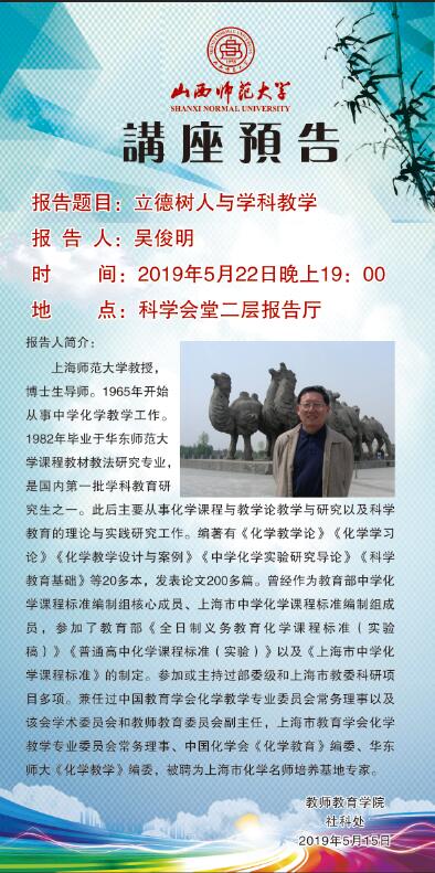 【预告】 上海师范大学吴俊明教授应教师教育学院邀请来永利官网作学术报告