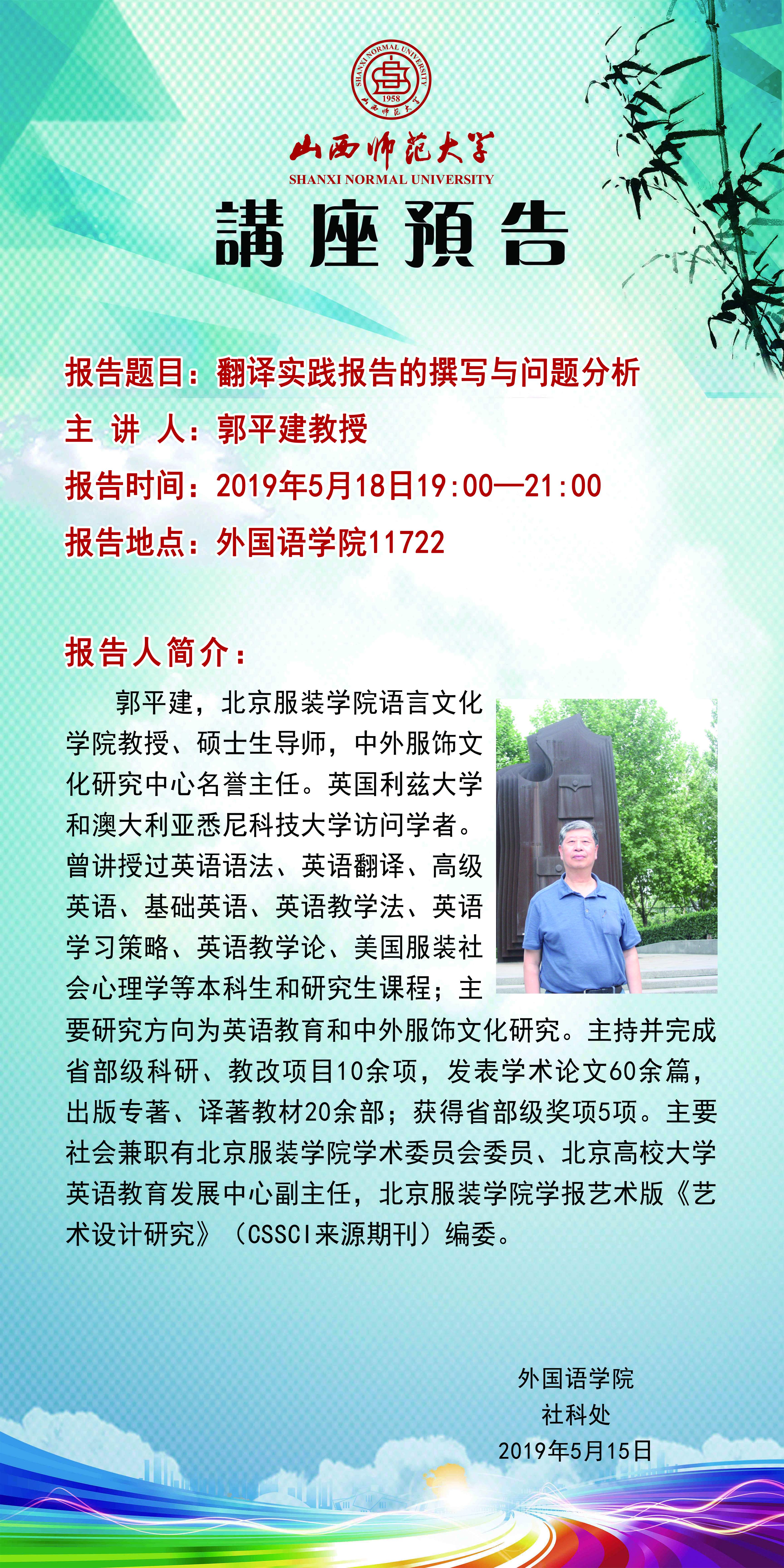 【预告】 北京服装学院郭平建教授应外国语学院邀请来永利官网作学术报告
