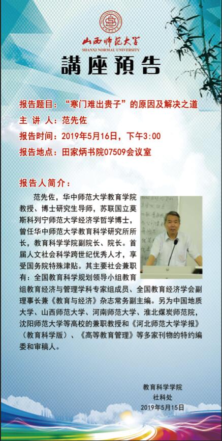 【预告】 华中师范大学范先佐教授应教育科学学院邀请来永利官网作学术报告