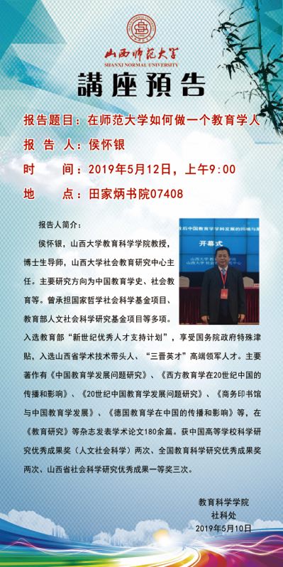 【预告】 山西大学侯怀银教授应教育科学学院邀请来永利官网作学术报告