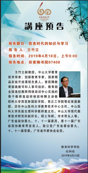 【预告】 中山大学王竹立教授应教育科学学院邀请来永利官网作学术报告