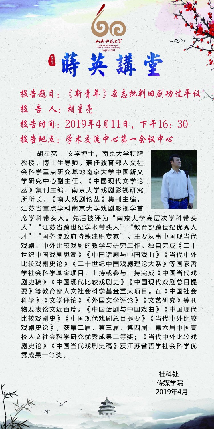 【预告】【莳英讲堂】南京大学胡星亮教授应传媒学院邀请来永利官网作学术报告