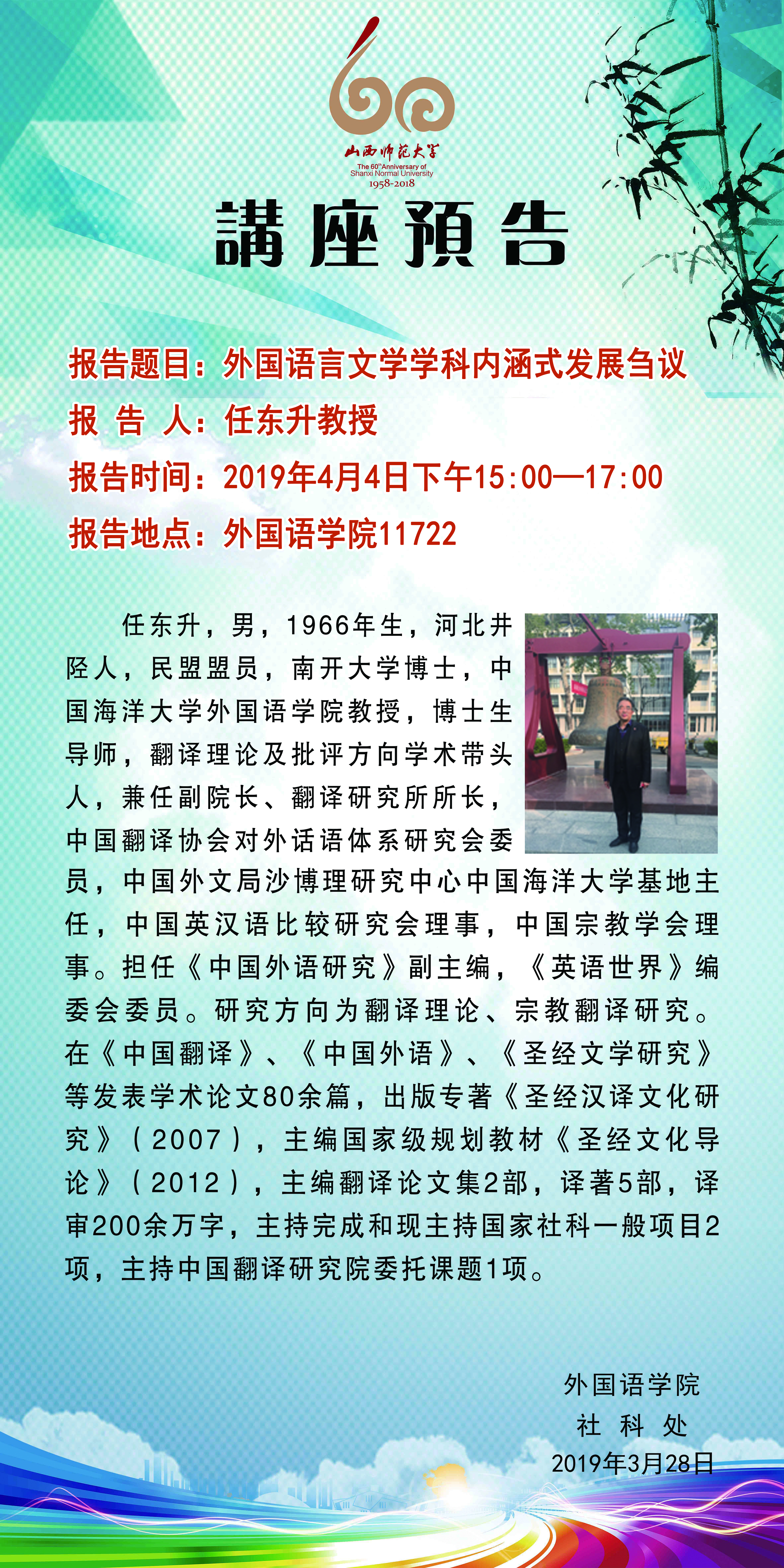 【预告】 中国海洋大学任东升教授应外国语学院邀请来永利官网作学术报告