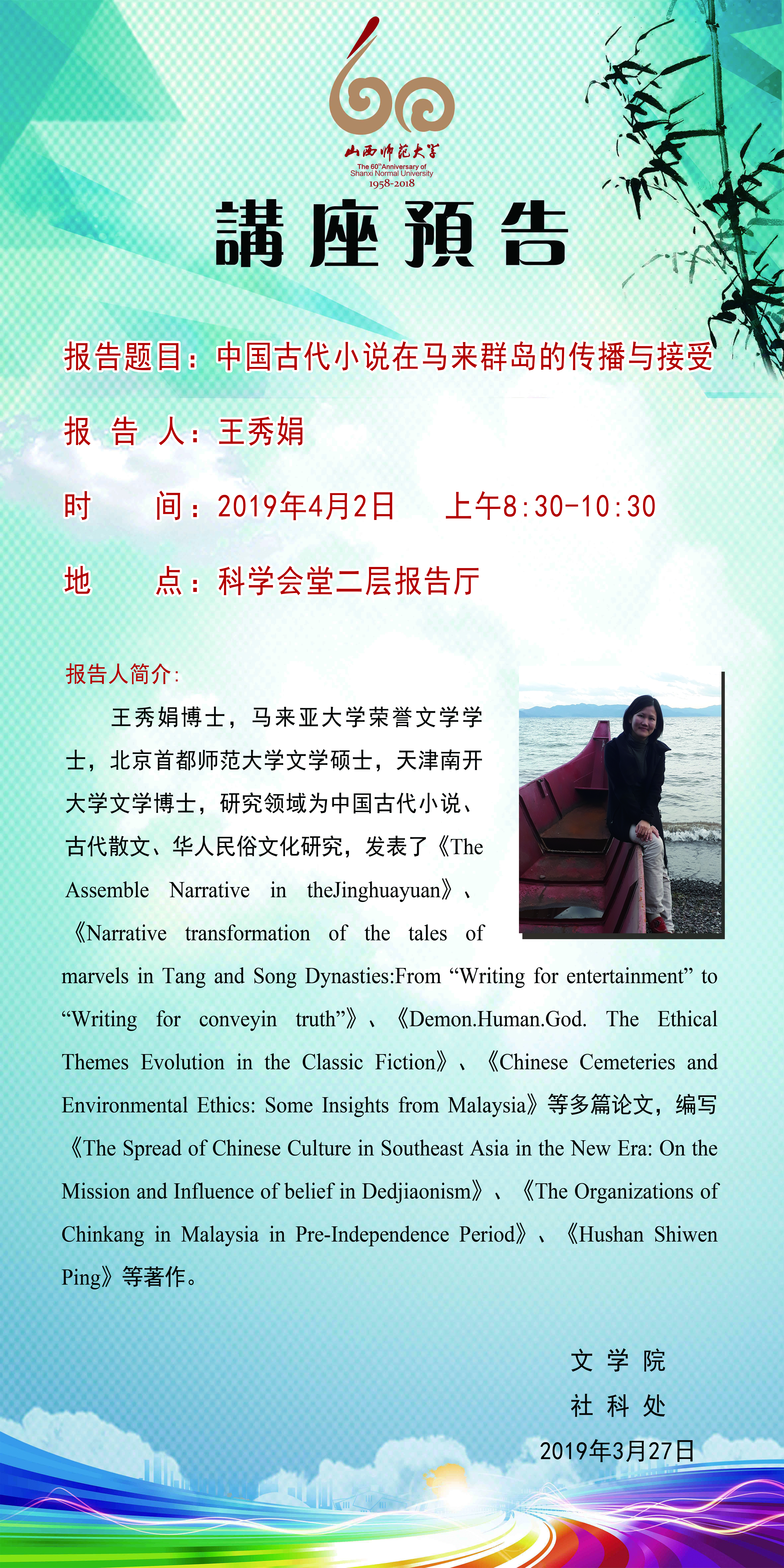 【预告】 马来亚大学王秀娟博士应文学院邀请来永利官网作学术报告