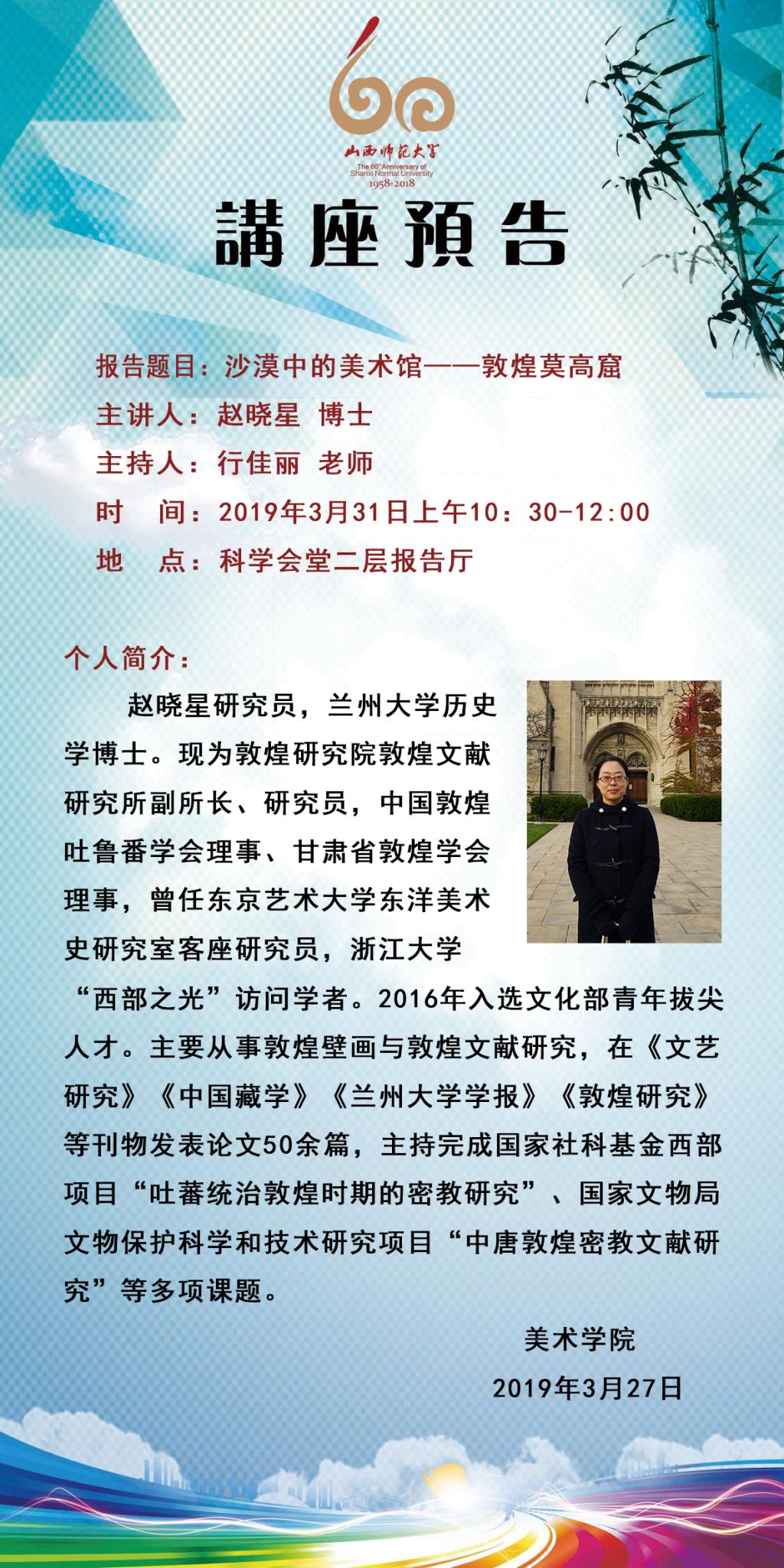 【预告】 敦煌研究院人文研究部副部长赵晓星博士应美术学院邀请来永利官网作学术报告