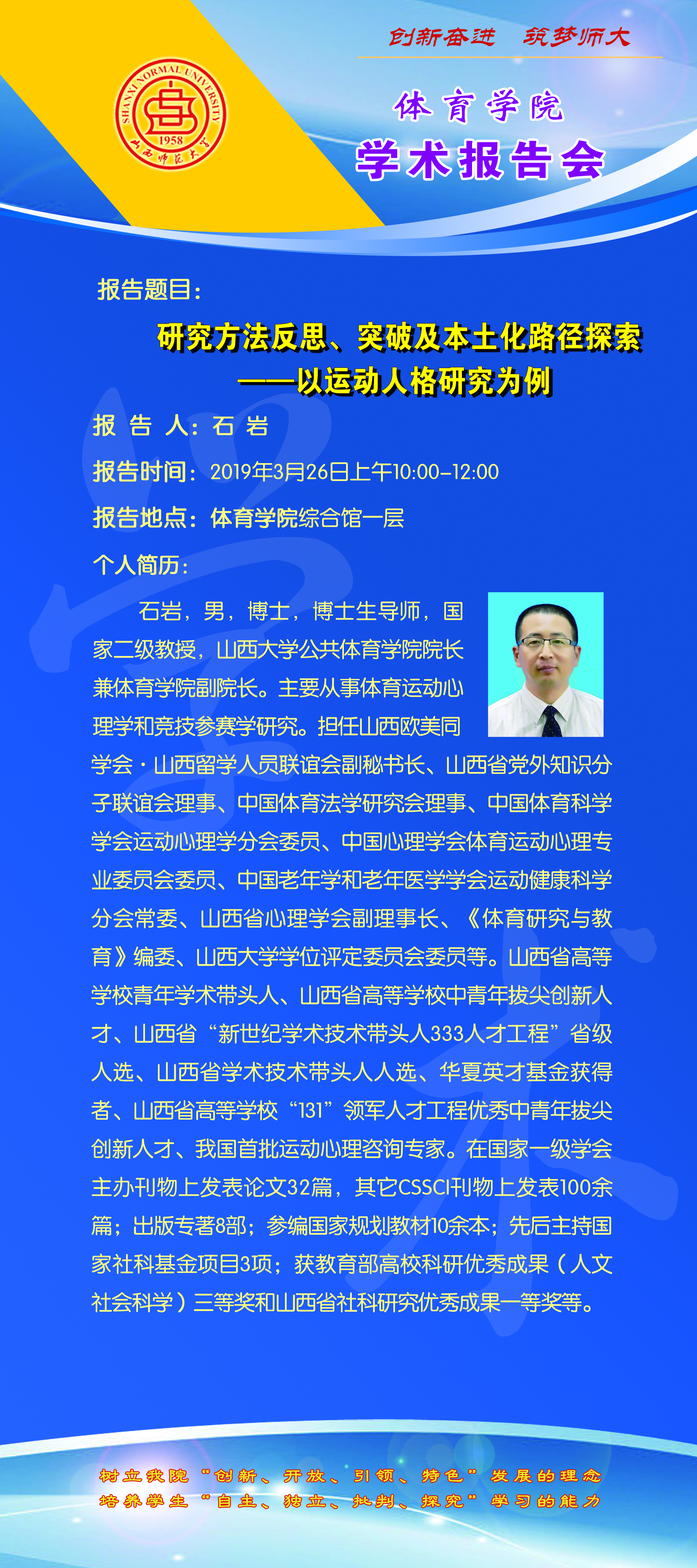 【预告】 山西大学公共体育学院院长石岩教授应体育学院邀请来永利官网作学术报告