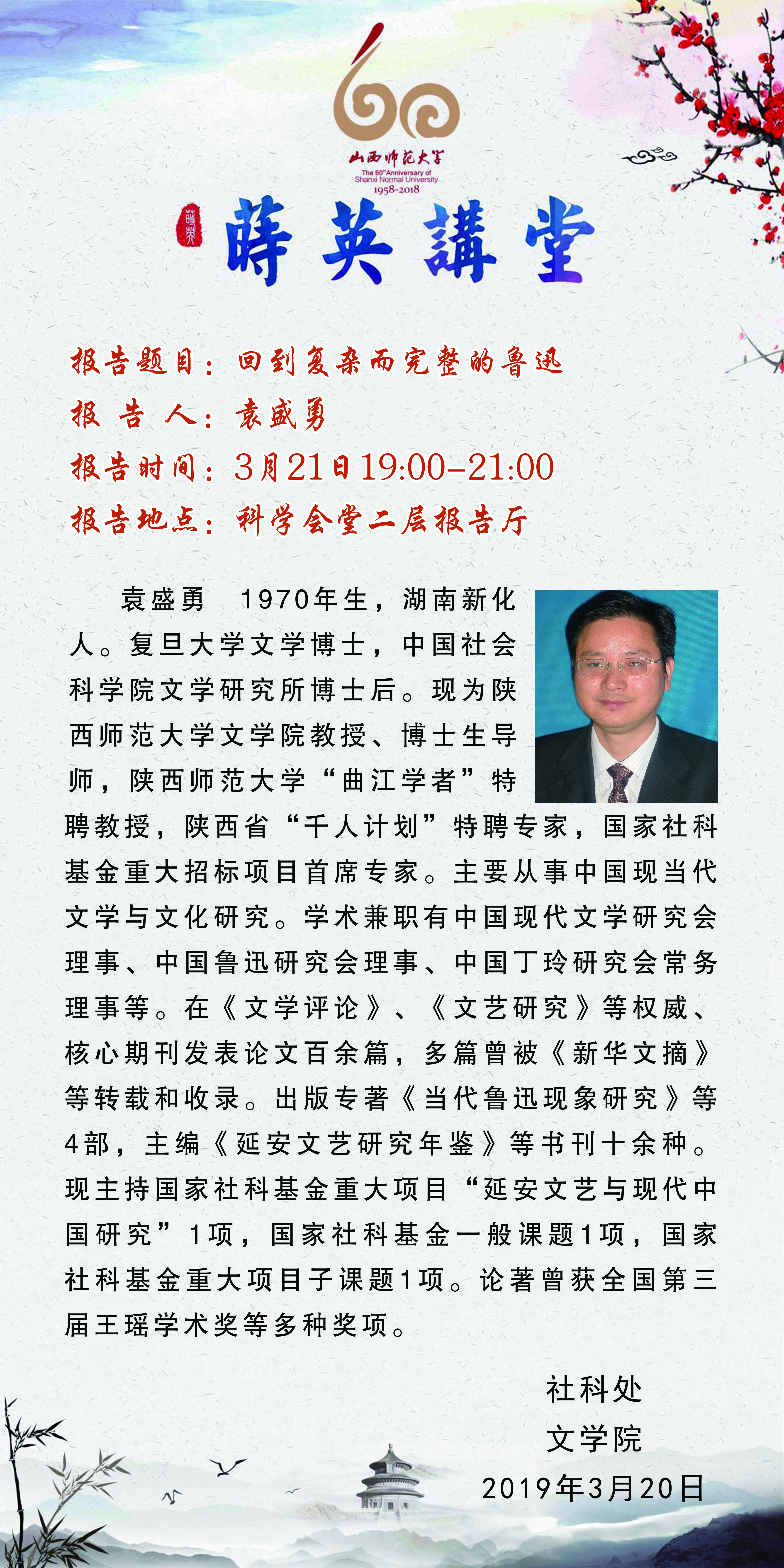 【预告】【莳英讲堂】陕西师范大学袁盛勇教授应文学院邀请来永利官网作学术报告