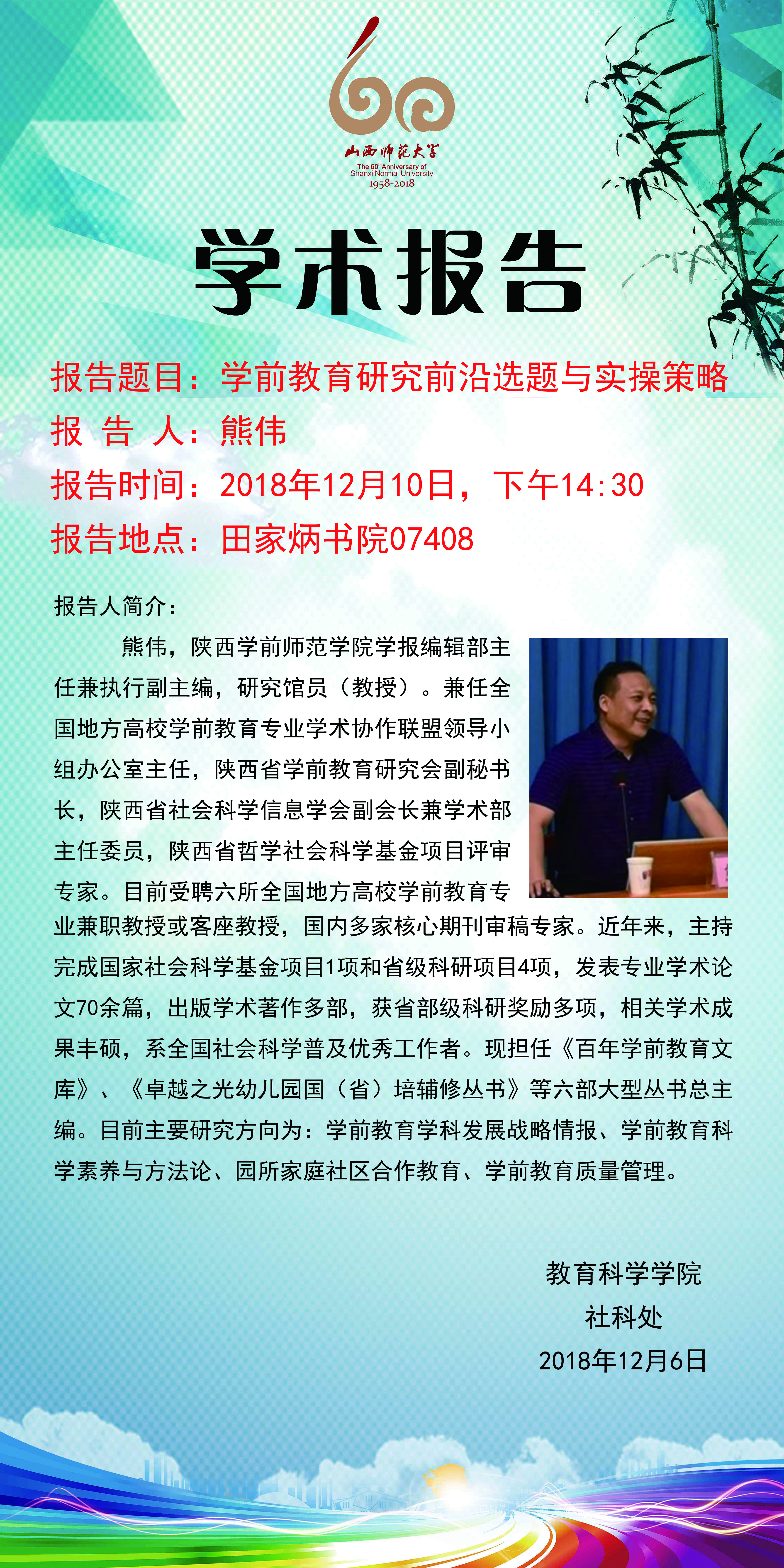 【预告】陕西学前师范学院学报编辑部熊伟主任应教育科学学院邀请来永利官网作学术报告