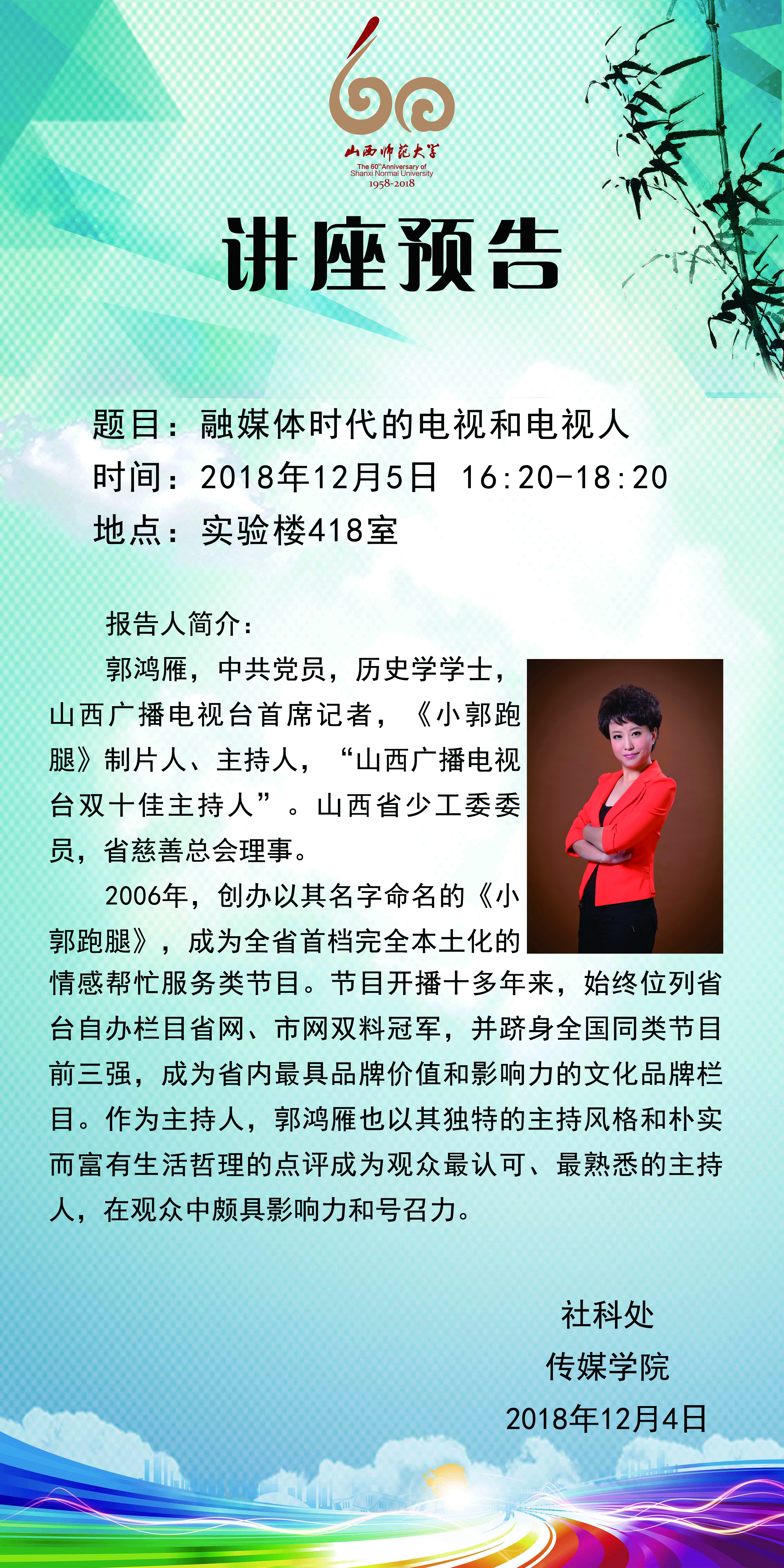 【预告】山西广播电视台首席记者,《小郭跑腿》制片人、主持人郭鸿雁应传媒学院邀请来永利官网作学术报告