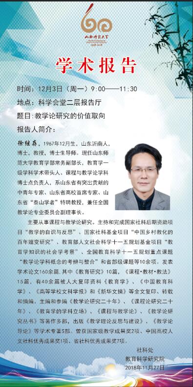 【预告】山东师范大学徐继存教授应教育科学研究院邀请来永利官网作学术报告