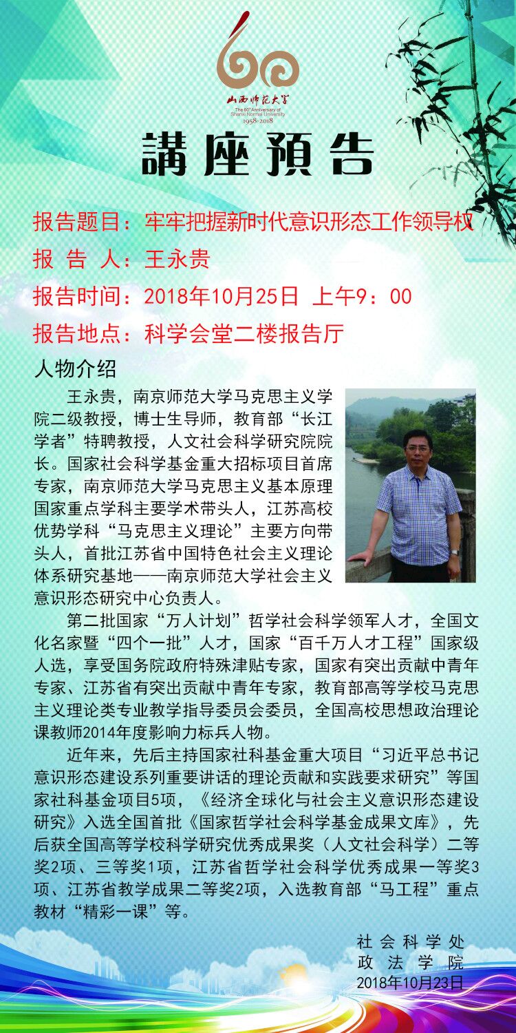 【预告】南京师范大学王永贵教授应政法学院邀请来永利官网作学术报告