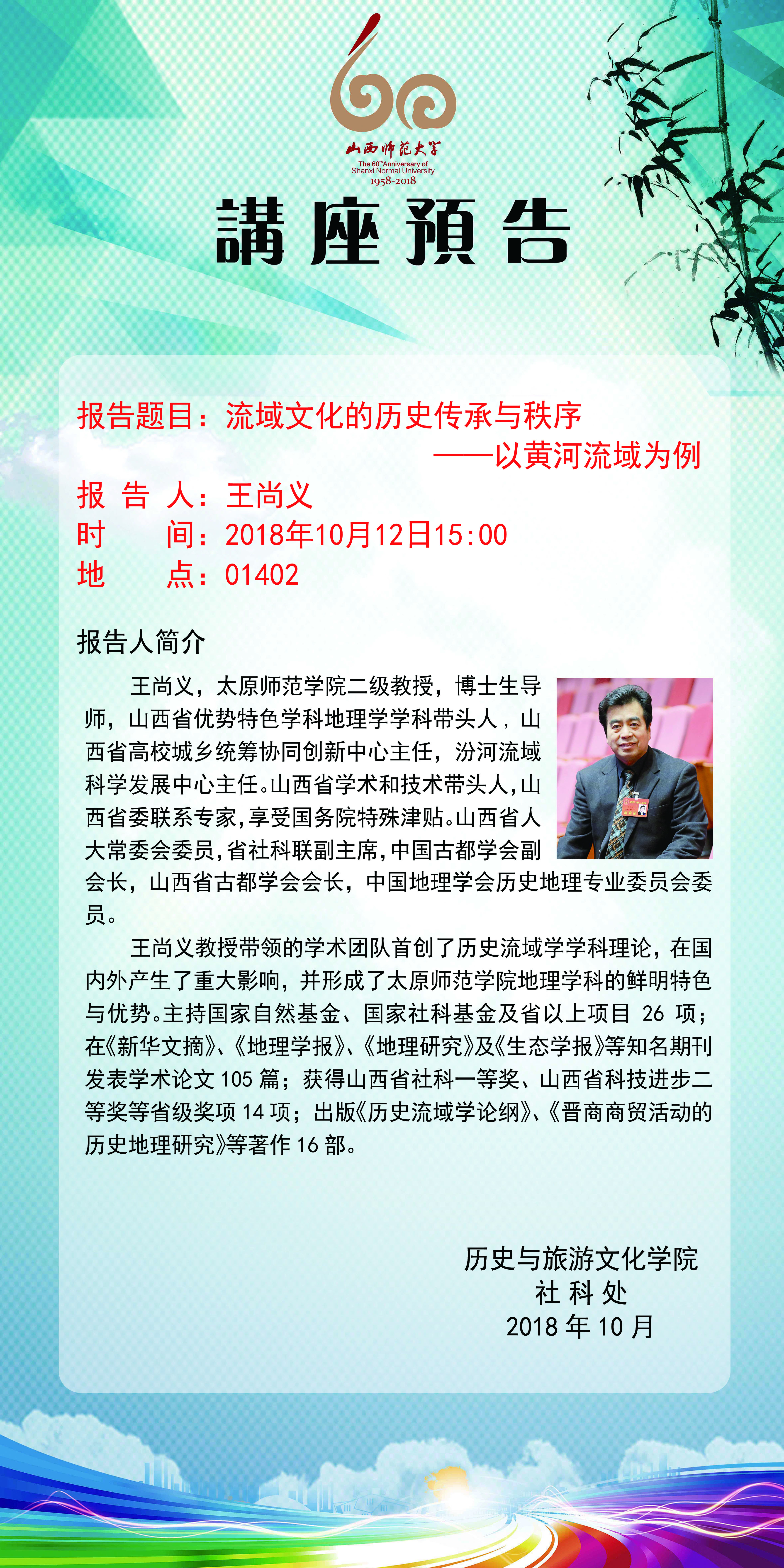 【预告】太原师范学院王尚义教授应历史与旅游文化学院邀请来永利官网作学术报告