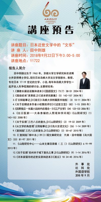 【预告】日本岛根大学法文学部部长田中则雄教授应邀来永利官网作学术报告