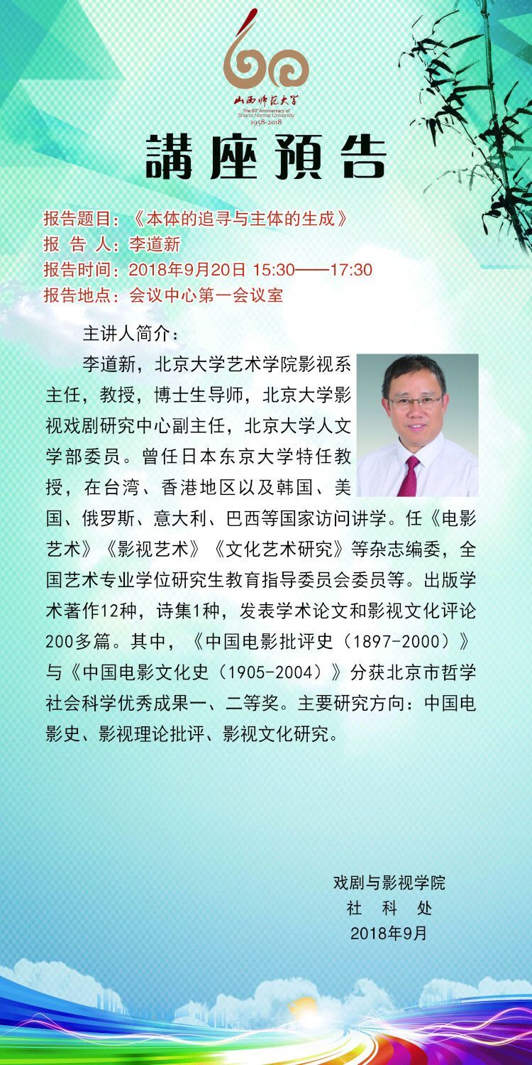 【预告】北京大学李道新教授应戏剧与影视学院邀请来永利官网作学术报告