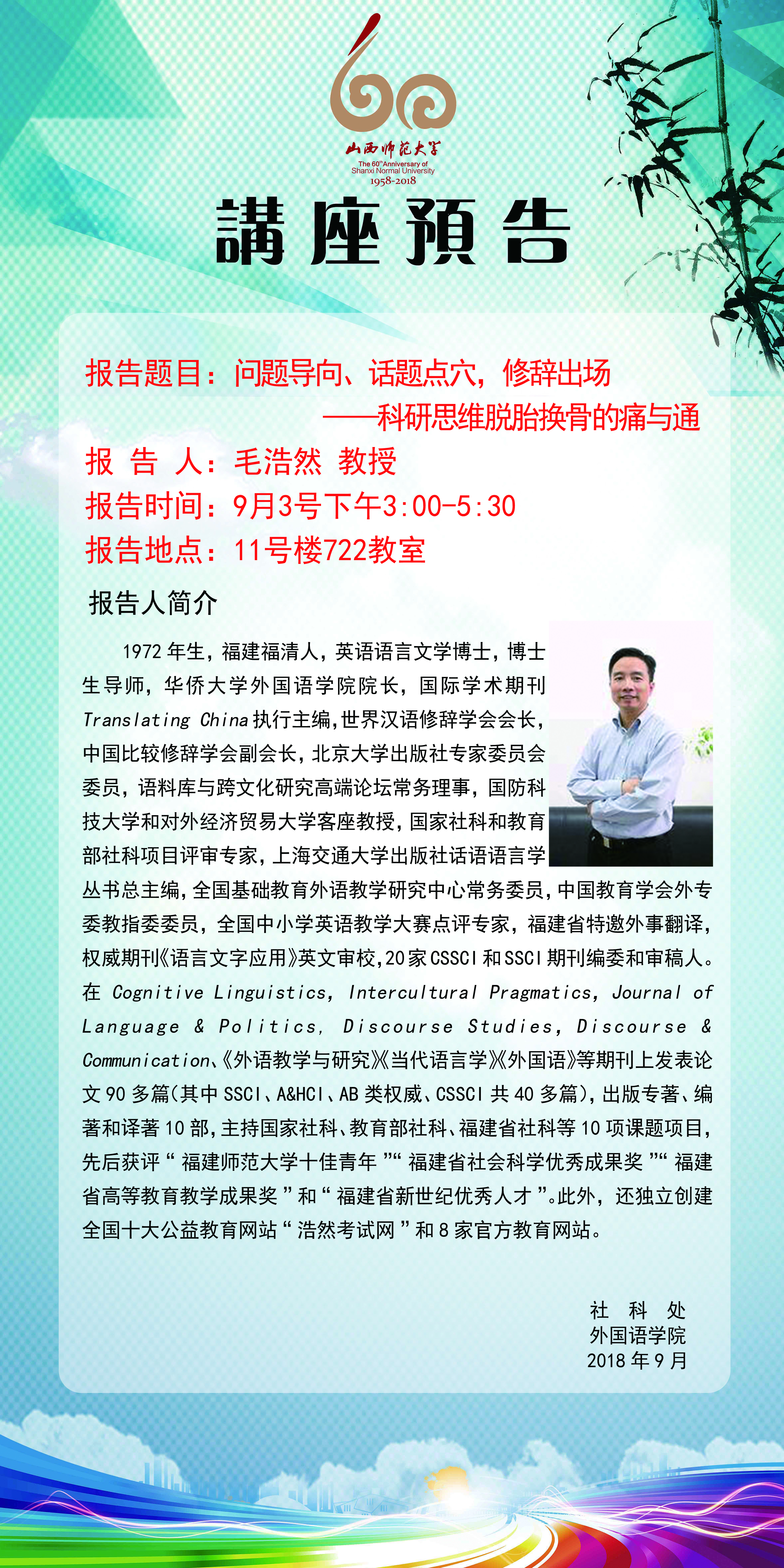 【预告】华侨大学外国语学院院长毛浩然教授应外国语学院邀请来永利官网作学术报告