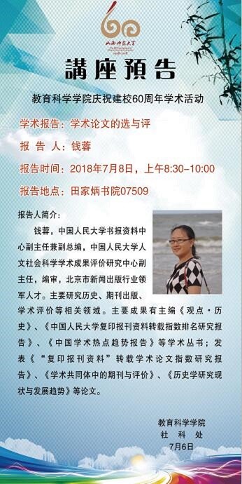 【预告】中国人民大学书报资料中心钱蓉副主任应教育科学学院邀请来永利官网作学术报告