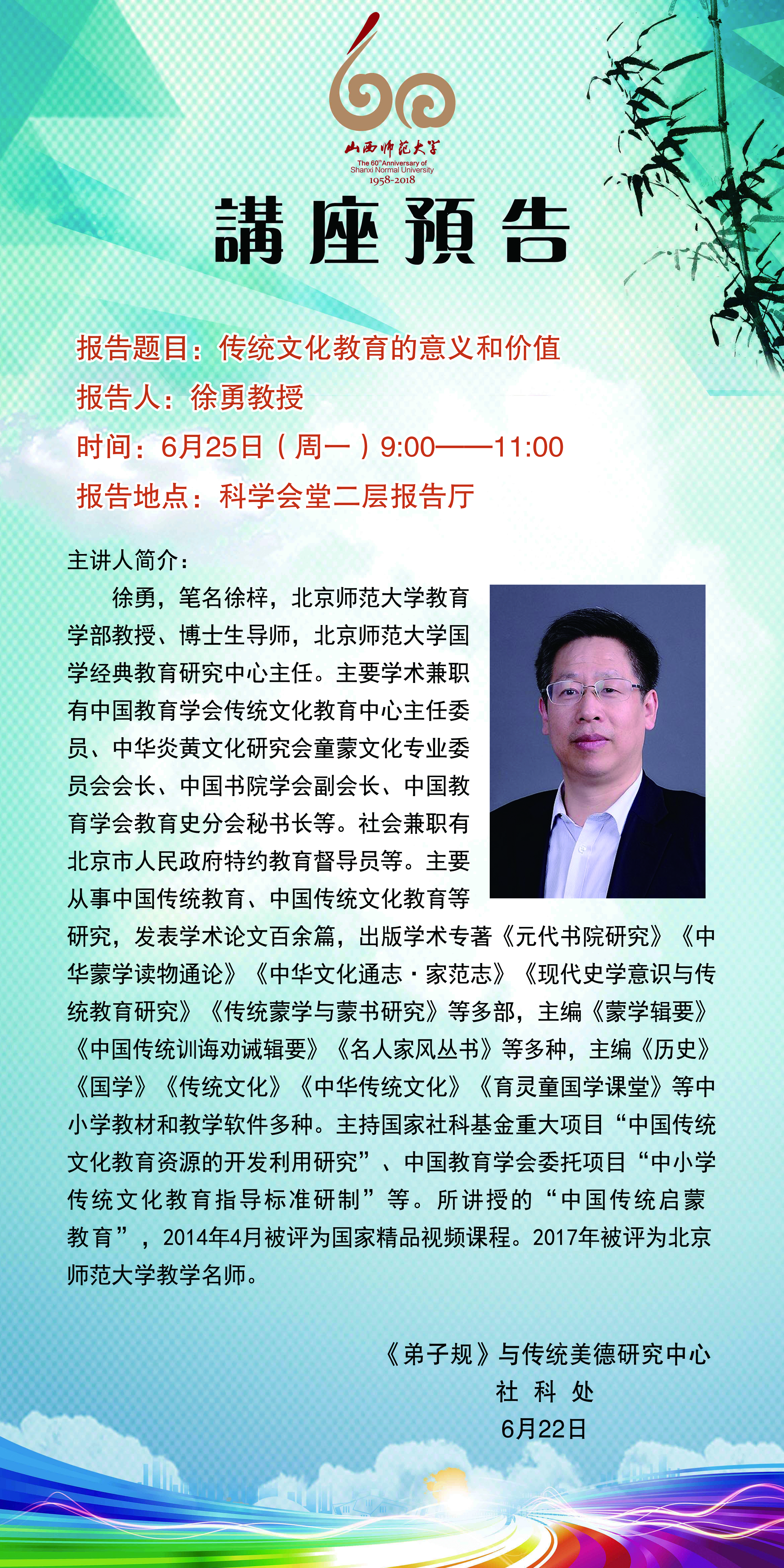 【预告】北京师范大学教育学院徐勇教授应《弟子规》与传统美德研究中心邀请来永利官网作学术报告