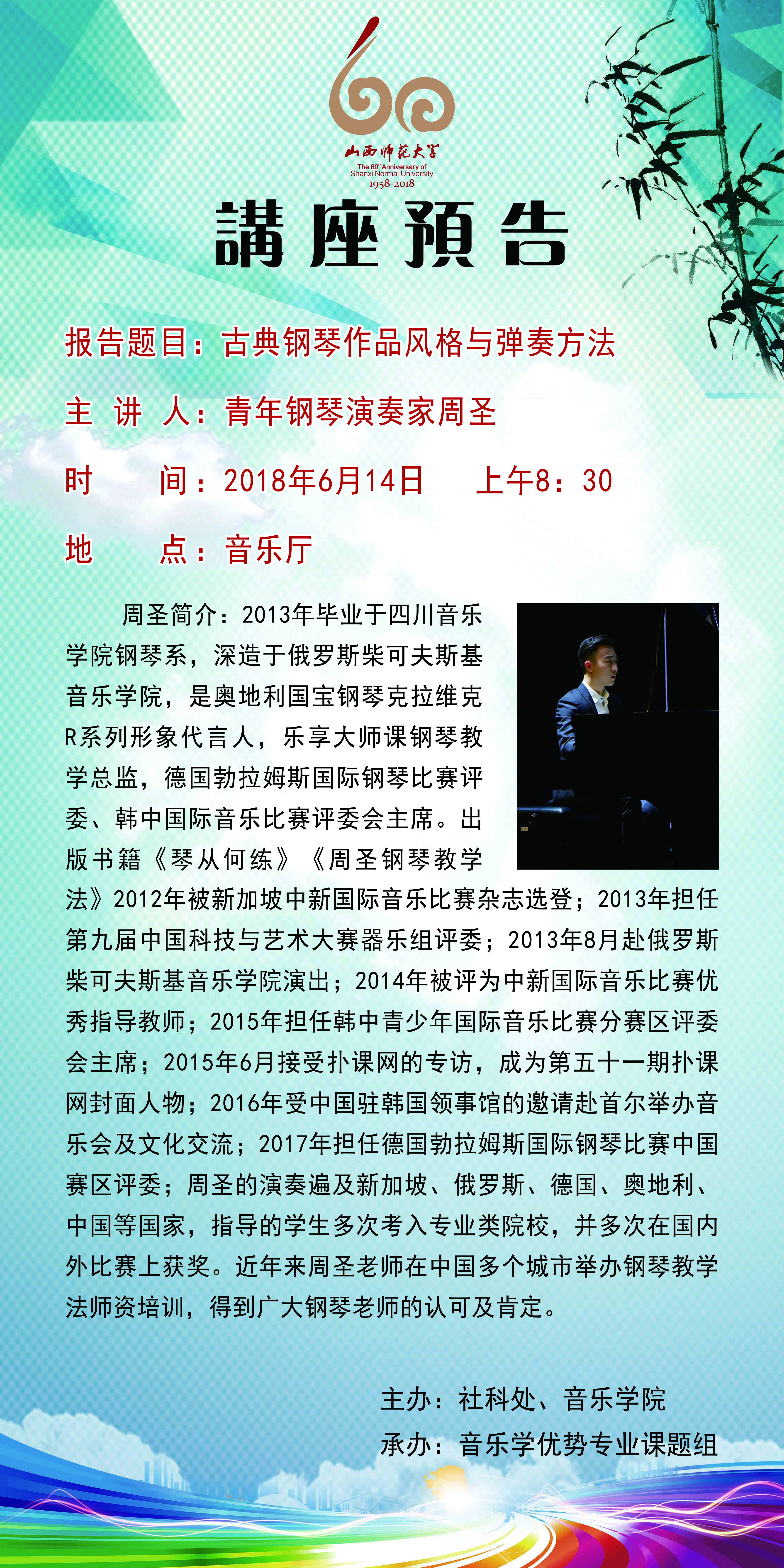 【预告】青年钢琴演奏家周圣老师应音乐学院邀请来永利官网作学术报告