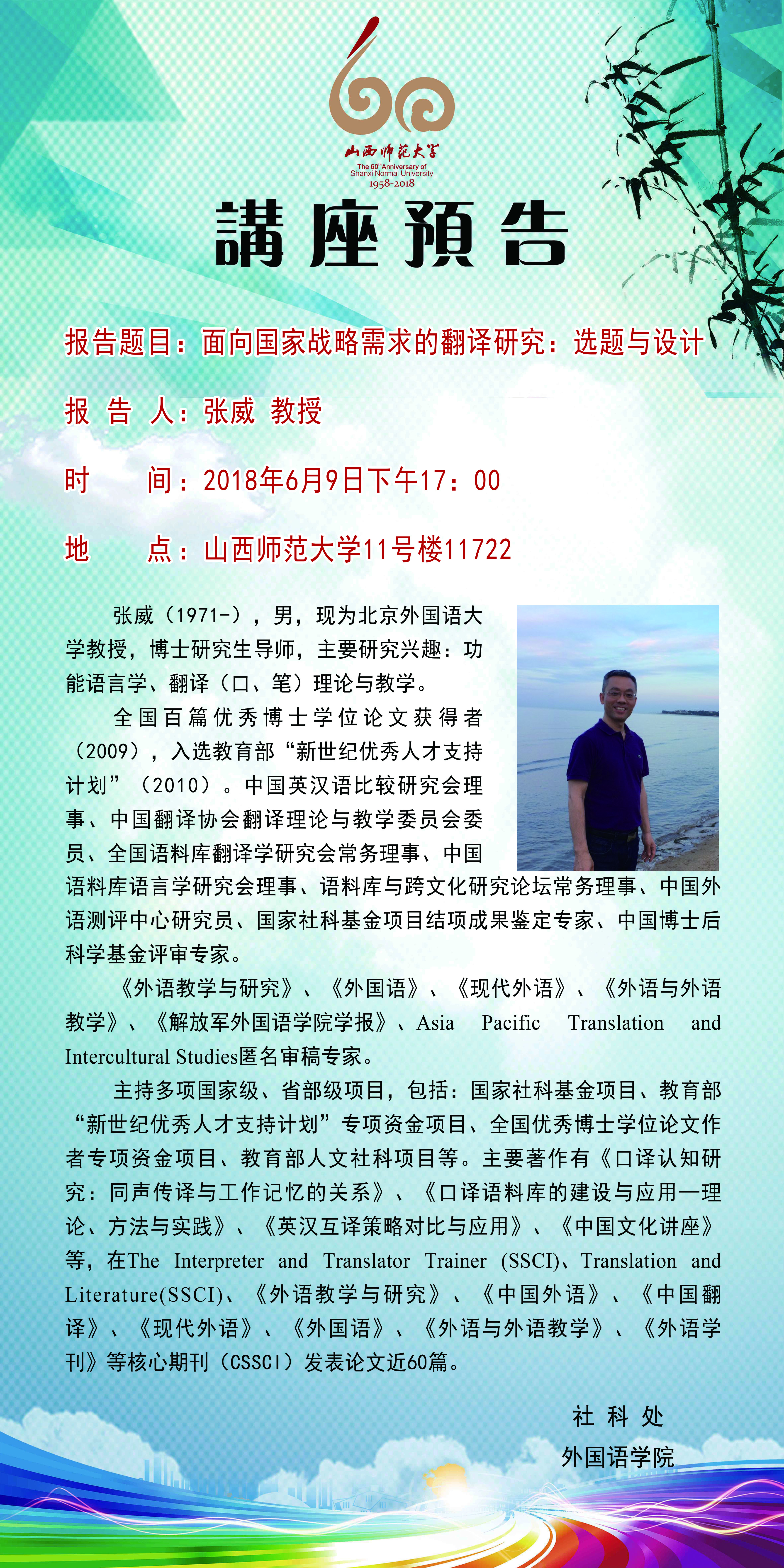【预告】北京外国语大学张威教授应外国语学院邀请来永利官网作学术报告