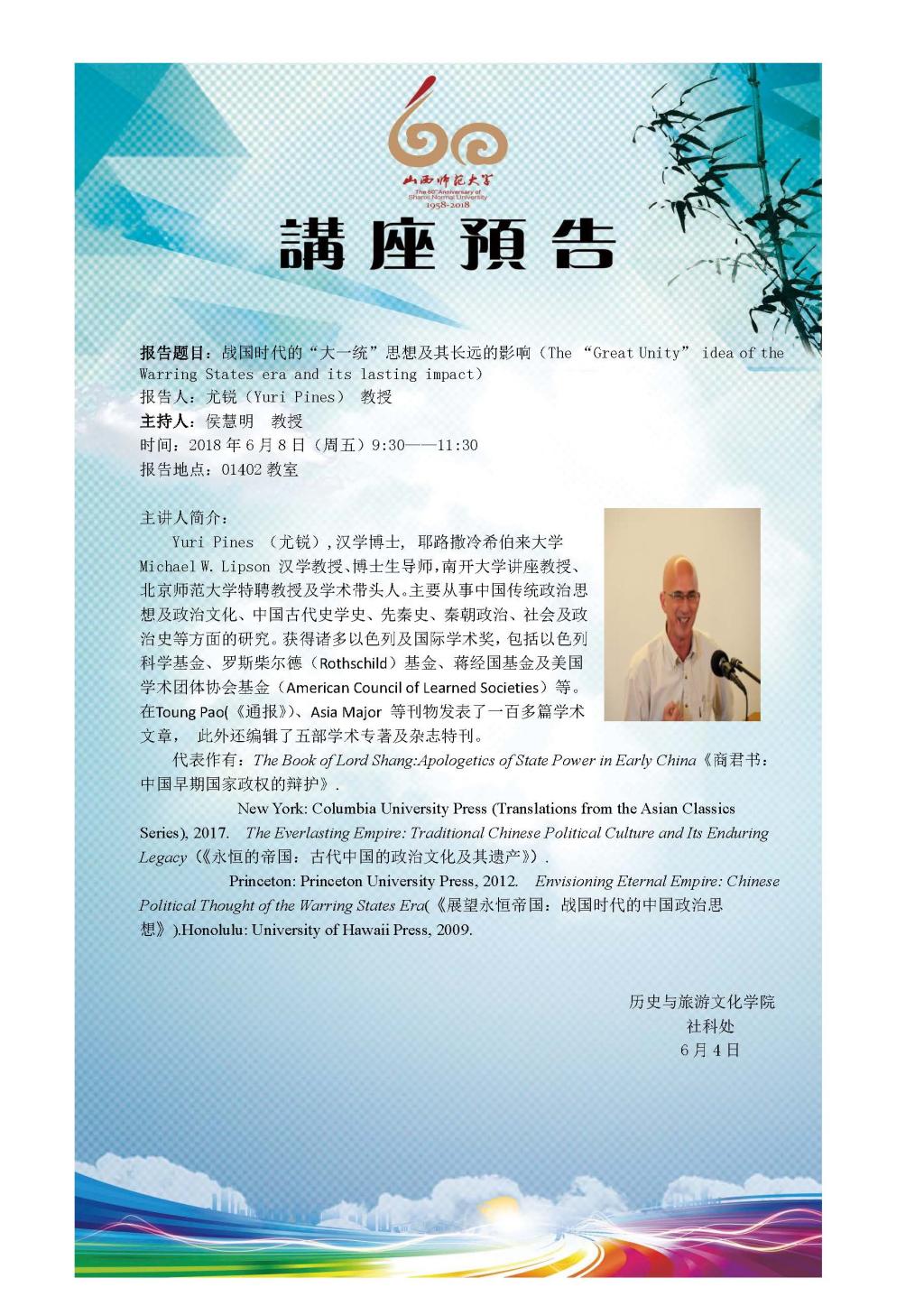 【预告】耶路撒冷希伯来大学尤锐(Yuri Pines)教授应历史与旅游文化学院邀请来永利官网作学术报告
