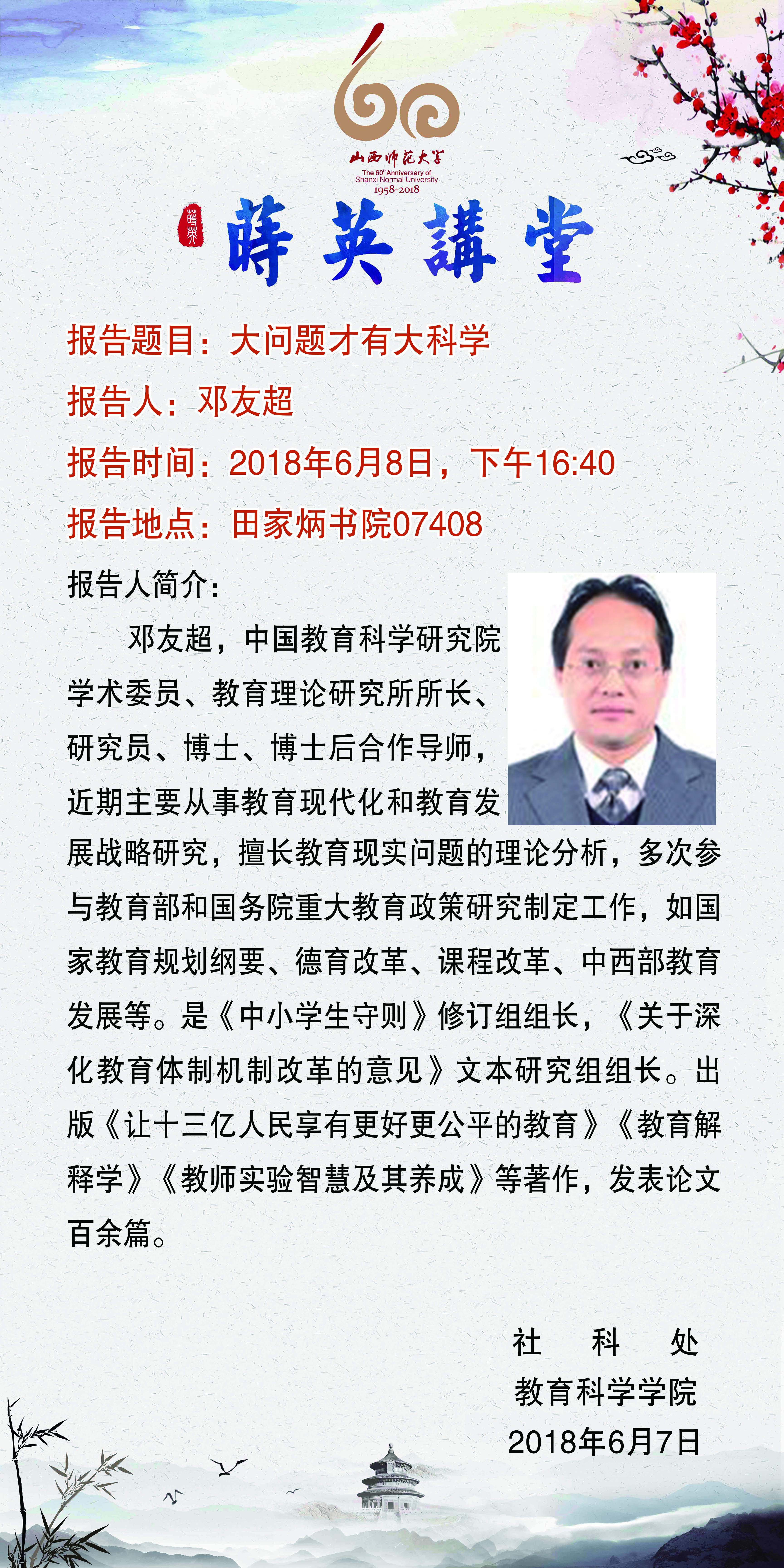 【预告】【莳英讲堂】中国教育科学研究院理论所所长邓友超教授应教育科学学院邀请来永利官网作学术报告