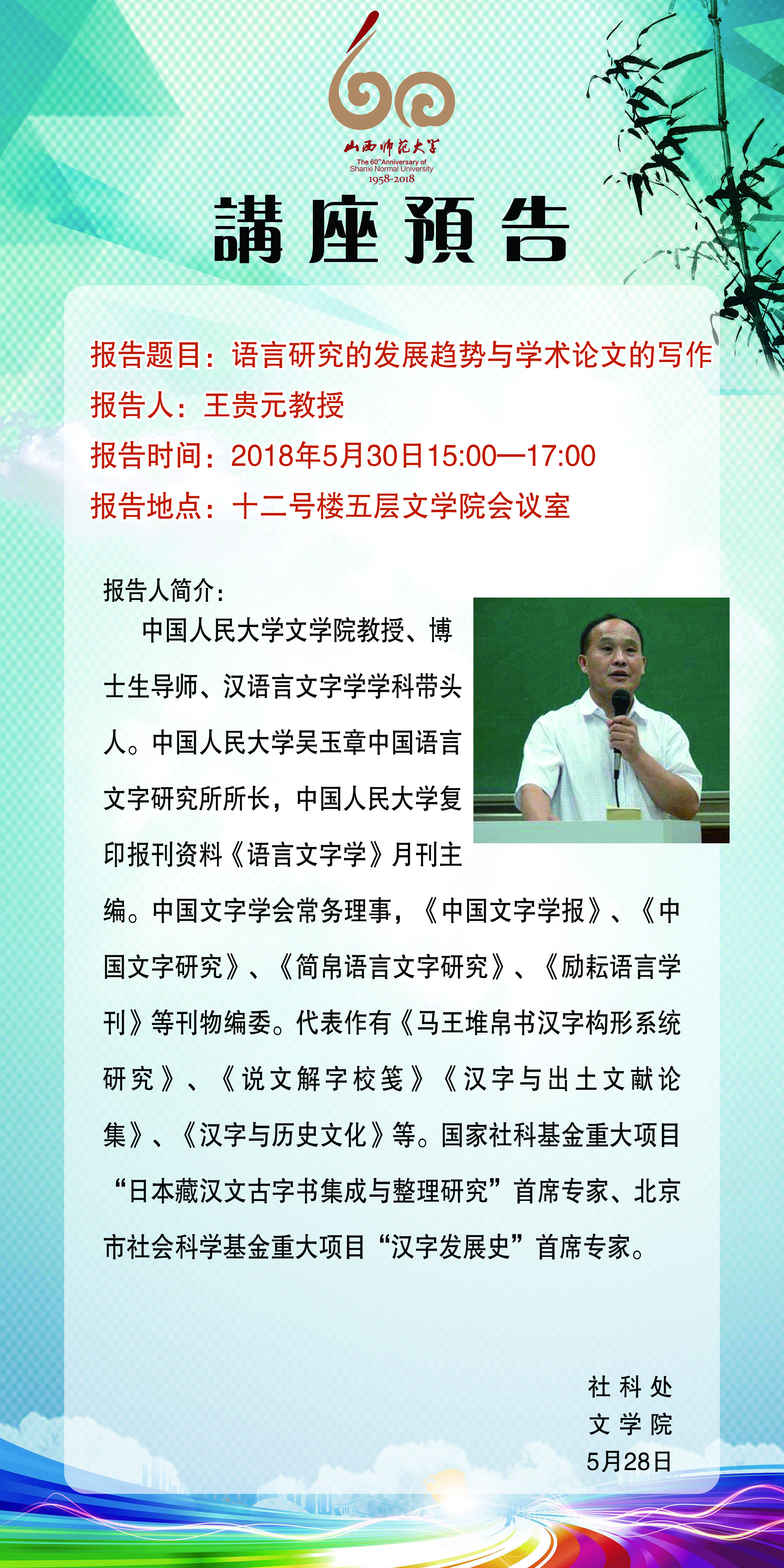 【预告】中国人民大学王贵元教授应文学院邀请来永利官网作学术报告