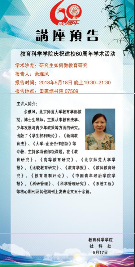 【预告】北京师范大学教育学部余雅风教授应教育科学学院邀请来永利官网作学术报告