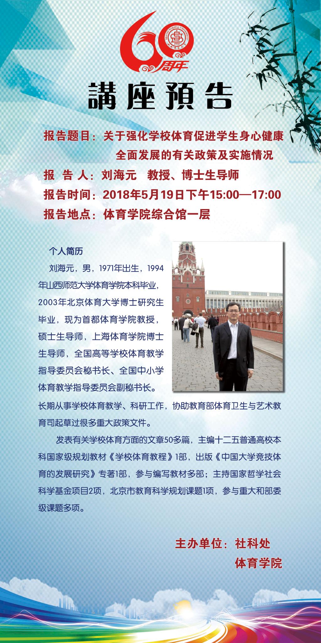 【预告】永利官网杰出校友首都体育学院刘海元教授应体育学院邀请来永利官网作学术报告