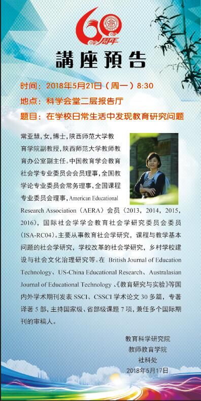 【预告】陕西师范大学常亚慧副教授应教育科学研究院、教师教育学院邀请来永利官网作学术报告