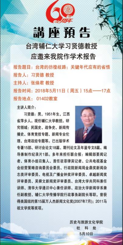 【预告】台湾辅仁大学习贤德教授应历史与旅游文化学院邀请来永利官网作学术报告